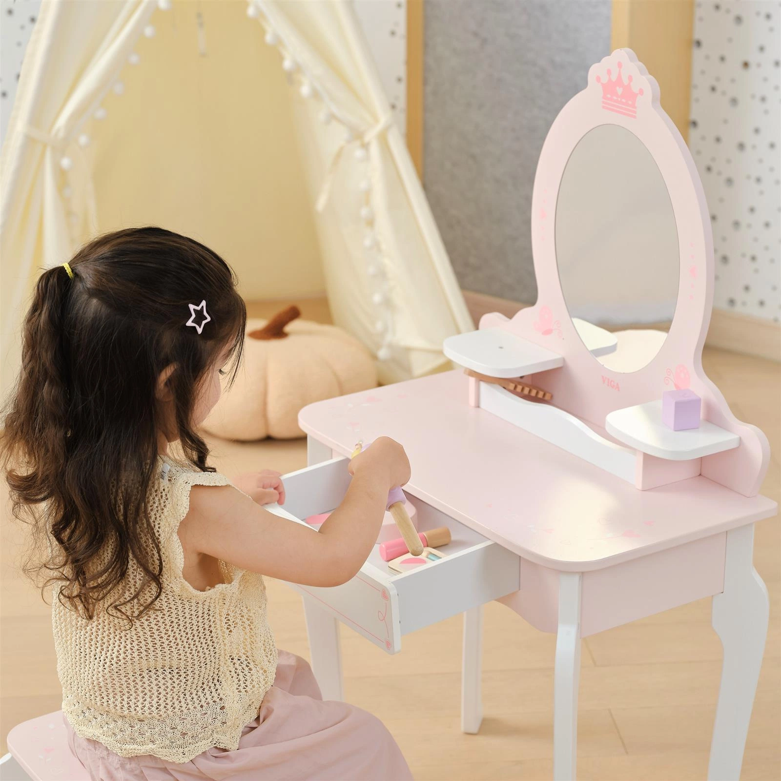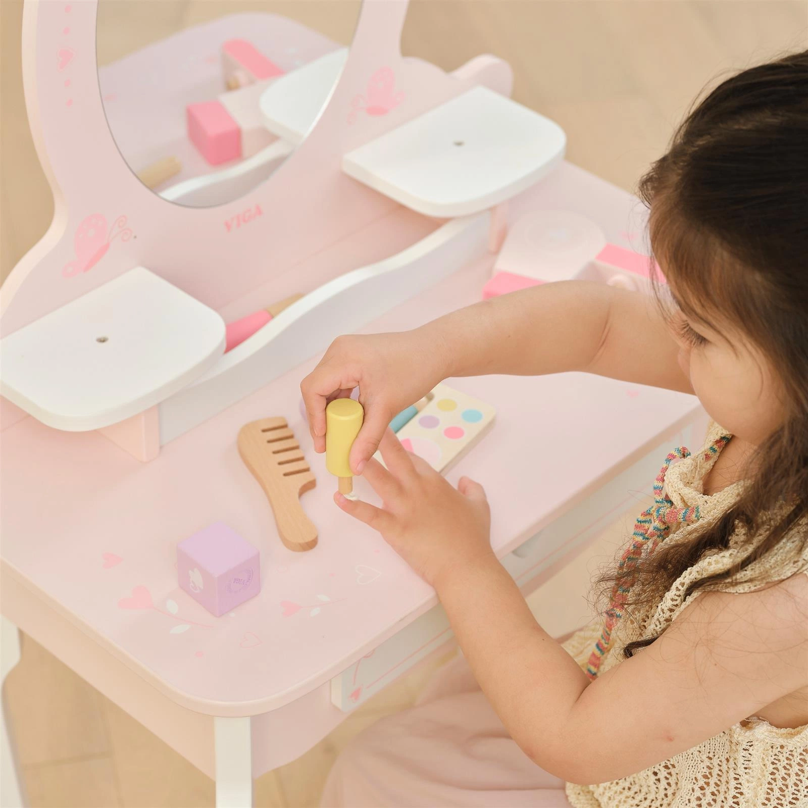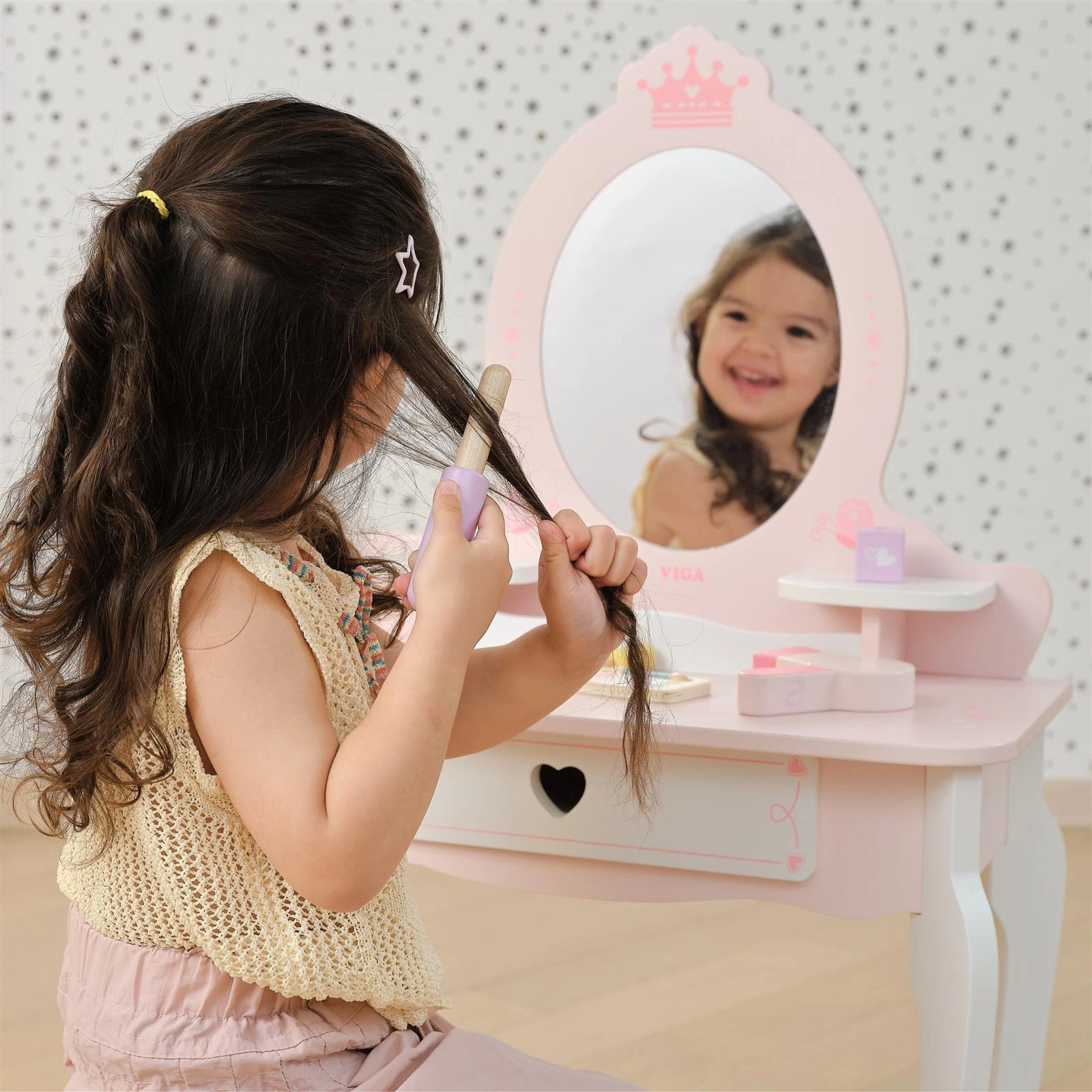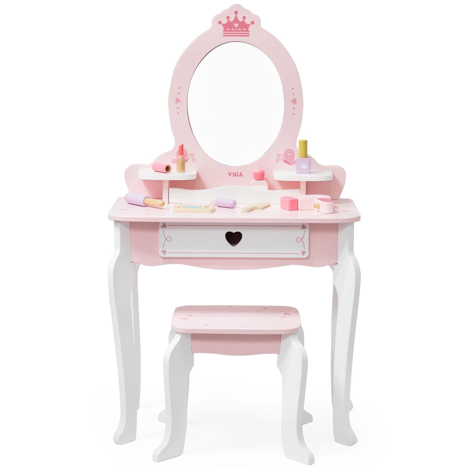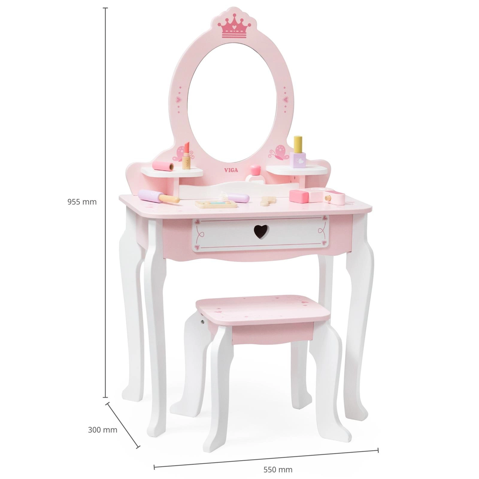 VIGA Duża Toaletka Drewniana Biało-Różowa z Lustrem i Krzesełkiem