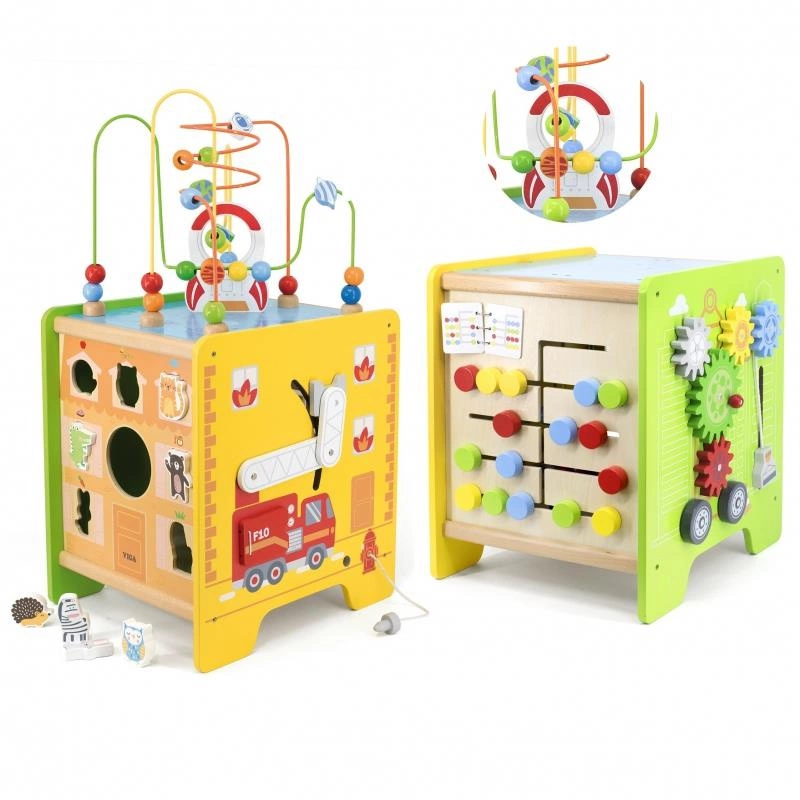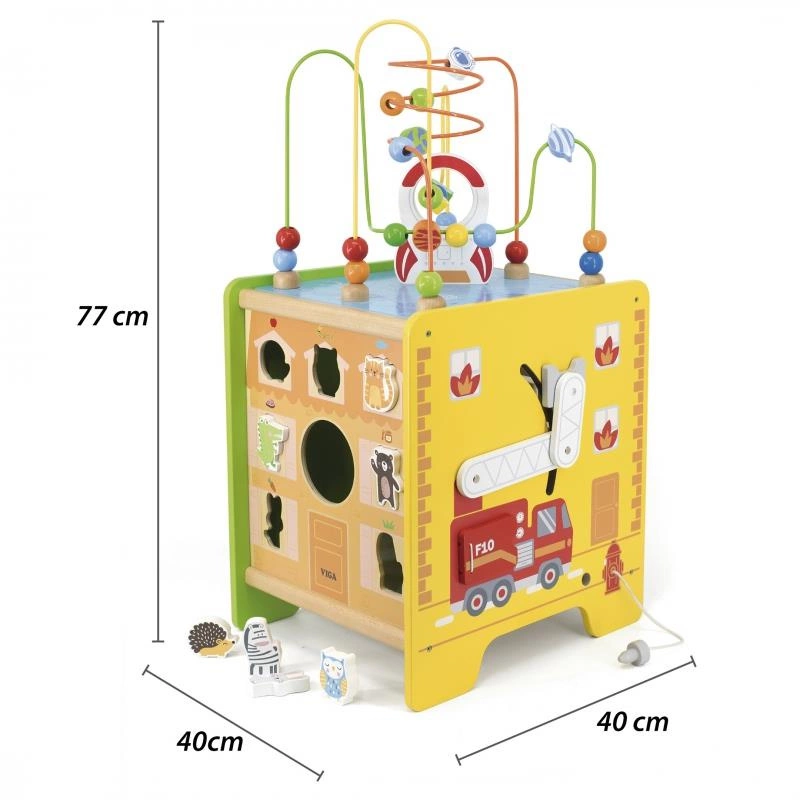VIGA Edukacyjny Sześcian Jumbo to wielofunkcyjna zabawka, dzięki której Twoje dziecko nie będzie się nudzić! Mnóstwo możliwości spędzania wolnego czasu z pewnością zaciekawi każdego malucha. Duża kostka edukacyjna składa się z labiryntu, sortera ze zwierzątkami, kół zębatych oraz wozu strażackiego, dzięki któremu mały strażak będzie mógł gasić pożary w budynku. Na górze zabawki znajduję się pętla z drewnianymi koralikami, dzięki której dziecko rozwija zdolności motoryczne. Produkt przeznaczony dla dzieci powyżej 18 miesiąca życia.