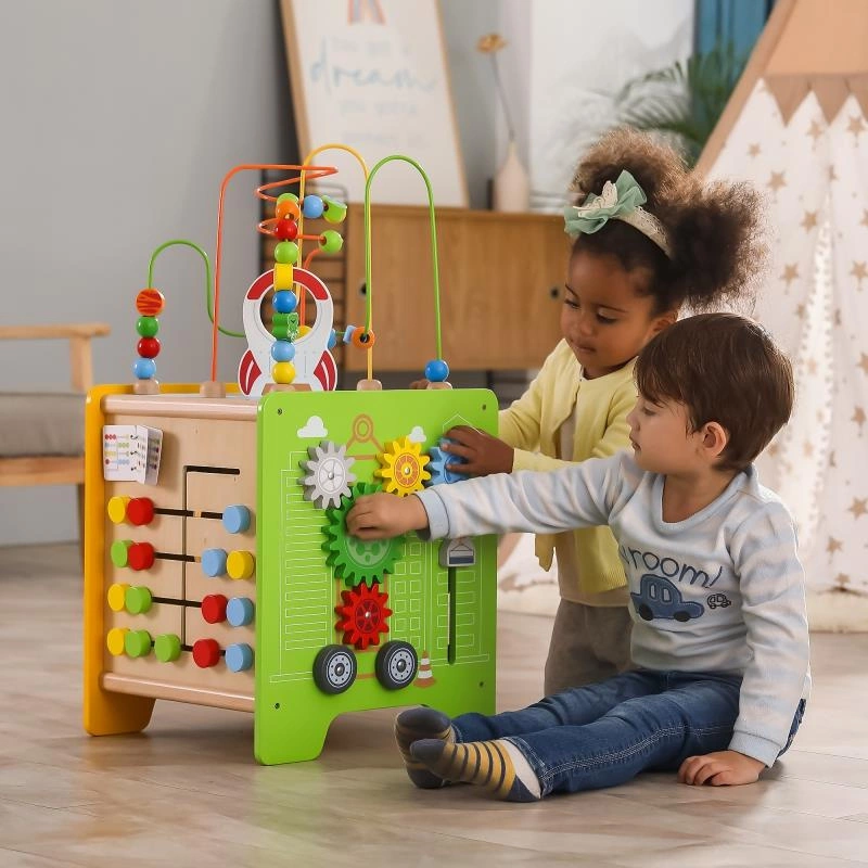 - - Zabawka składa się 5 różnych propozycji do zabawy: labiryntu, sortera ze zwierzątkami, kół zębatych, wozu strażackiego oraz pętli z drewnianymi koralikami