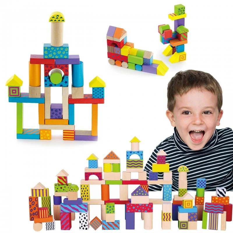 Drewniane, kolorowe klocki od firmy Viga, sprawią mnóstwo radości i zajmą dziecko zabawą na wiele godzin. Zestaw zawiera aż 100 elementów, z których można różne wersje kolorowego miasta, a pomoże w tym książeczka z instrukcjami, która dołączona jest do zestawu. Zabawka ta rewelacyjnie wpłynie na rozwój malucha – poprzez wyśmienitą zabawę będzie kształtowało precyzję ruchów rączek, poprawi koordynację wzrokowo – ruchową. Dodatkowo całość zapakowana jest w wiaderko, które umożliwi utrzymanie porządku w każdym dziecięcym pokoju oraz ułatwi przenoszenie całego zestawu.