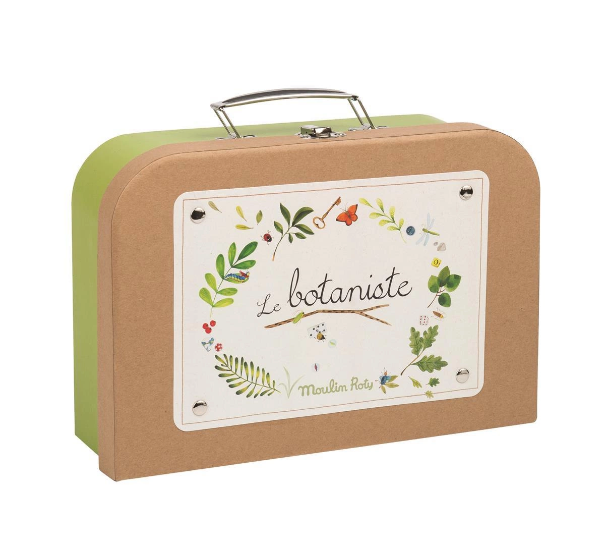 Walizka młodego botanika, zawierająca wszystkie przybory potrzebne do obserwacji natury oraz do zasuszenia lisci i kiwatów W skład zestawu wchodzą: szkło powiększające, drewniana prasa do kwiatów, notatnik i 3 piękne pudełka z ilustracjami, aby przechować swoje skarby.