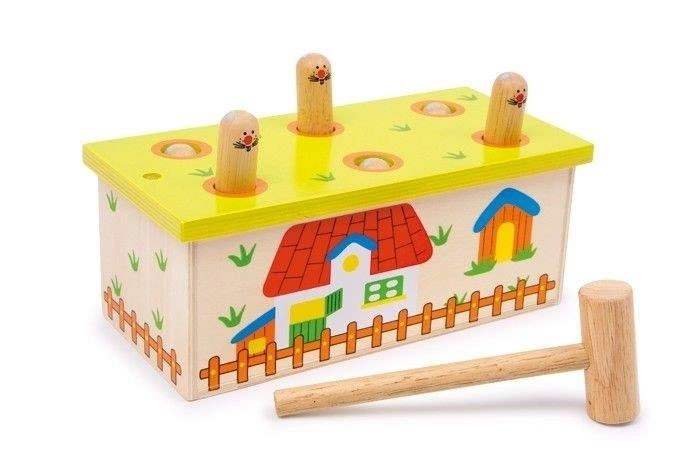 Stabilne barwnie lakierowane, drewniane pudełko. Za pomocą drewnianego młotka wbija się robaczki w ziemię. Problem w tym, że jeśli jeden robak zostanie pogrążony, natychmiast wyłania się nowy na powierzchni. Te masywne robaczki z wesołymi buźkami dają dużo radości.