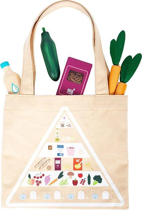 Zabawa w kuchnię? A może sklep? Wszędzie tam, gdzie pojawia się odgrywanie ról z wykorzystaniem produktów spożywczych, sprawdzi się duży, wieloelementowy zestaw zabawkowego jedzenia w komplecie z bawełnianą torbą z motywem piramidy żywieniowej.