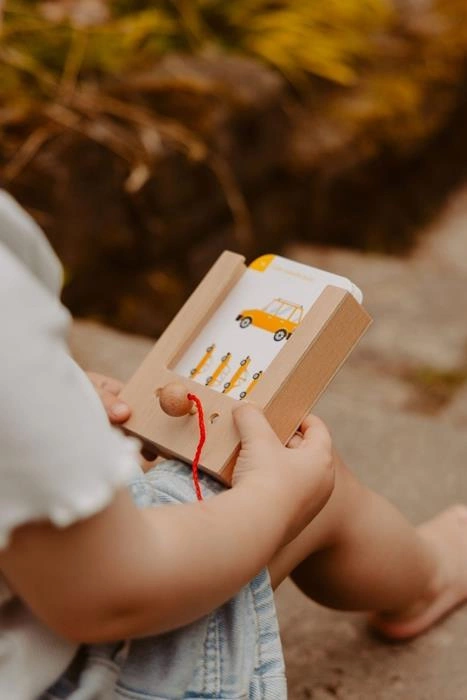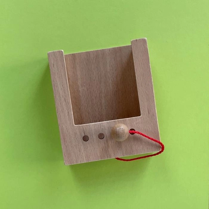 Włóż kartę do drewnianego pudełka i zaznacz odpowiedź patyczkiem. Jeśli jest poprawna – karta wysunie się z pudełka. Jeśli nie – zostanie na miejscu. Ten prosty mechanizm autokorekty daje dziecku natychmiastową informację zwrotną, wzmacnia poczucie sukcesu i uczy samodzielnego myślenia.