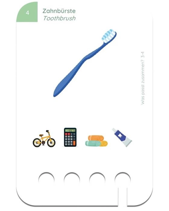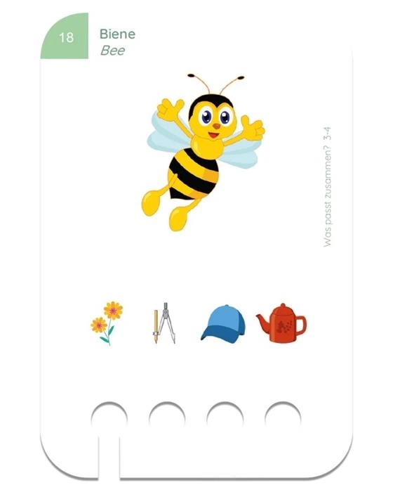 Karty są zadrukowane po obu stronach w języku niemieckim i angielskim, dzięki czemu dziecko może rozwijać swoje kompetencje językowe bez konieczności znajomości tych języków. Zabawa jest intuicyjna i nie wymaga umiejętności czytania.