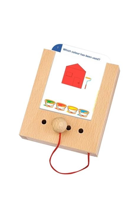 Włóż kartę do Drewnianego Pudełka WiemTo (do kupienia osobno), zaznacz odpowiedź drewnianym patyczkiem. Jeśli odpowiedź jest poprawna – karta wysunie się z pudełka. Jeśli nie – zostanie w środku. Ten prosty mechanizm daje dziecku satysfakcję i motywuje do samodzielnego myślenia.