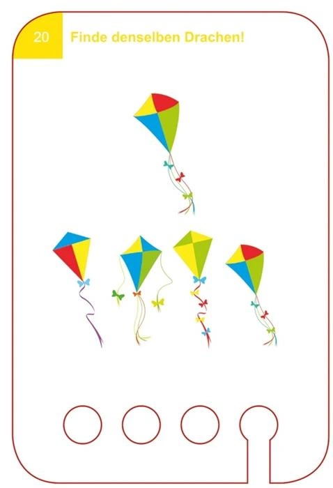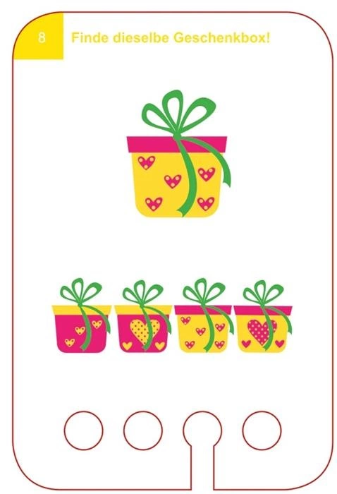 Zestaw „Znajdź Taki Sam Obrazek” zawiera 24 dwustronne karty z 24 zadaniami rozwijającymi spostrzegawczość i logiczne myślenie. Dziecko ćwiczy rozpoznawanie wzorów, porównywanie elementów i znajdowanie identycznych obrazków. Zadania mają zróżnicowany poziom trudności, dzięki czemu rosną razem z umiejętnościami dziecka.