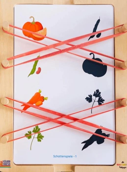 - Połącz obrazki po lewej stronie karty z pasującymi ilustracjami po prawej, rozciągając gumki na kołkach.