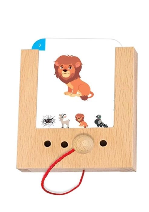 Wystarczy włożyć kartę do drewnianego pudełka WiemTo (sprzedawanego osobno) i zaznaczyć odpowiedź drewnianym patyczkiem. Jeśli odpowiedź jest poprawna — dziecko może wyjąć kartę. W przypadku błędnej odpowiedzi — karta zostaje w pudełku. Prosty mechanizm, który daje radość z nauki i buduje samodzielność.