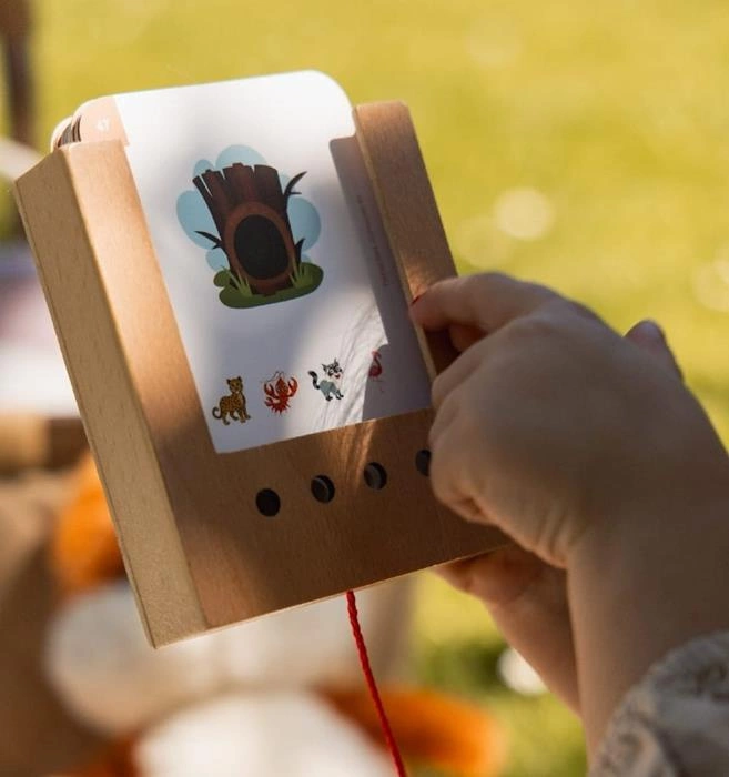 Karty należy wsunąć do specjalnego drewnianego pudełka. Dziecko zaznacza odpowiedź drewnianym patyczkiem – jeśli wybierze dobrze, kartę można wyjąć; jeśli nie – karta zostaje na miejscu. Ten prosty system autokorekty daje natychmiastową informację zwrotną, buduje pewność siebie i wspiera samodzielne myślenie.