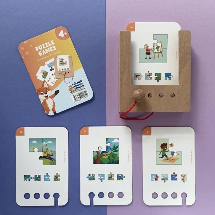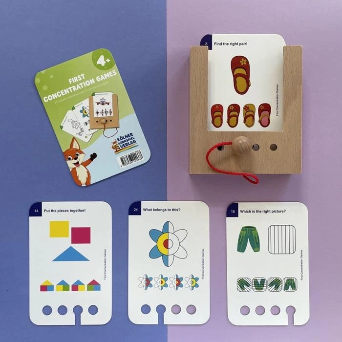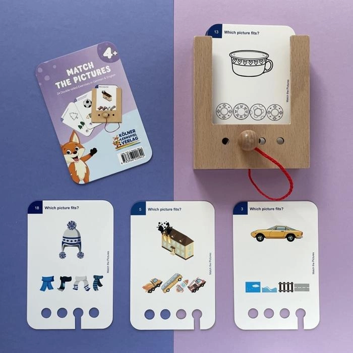 Karty wspierają rozwój pamięci, koncentracji, logicznego myślenia i motoryki małej – dzięki pracy z drewnianym patyczkiem. Wszystkie karty są dwustronnie zadrukowane w języku niemieckim i angielskim, co dodatkowo wspiera rozwój językowy. Zabawa nie wymaga umiejętności czytania ani znajomości języków.