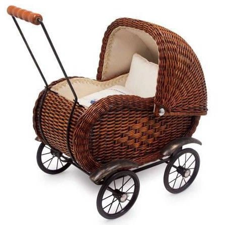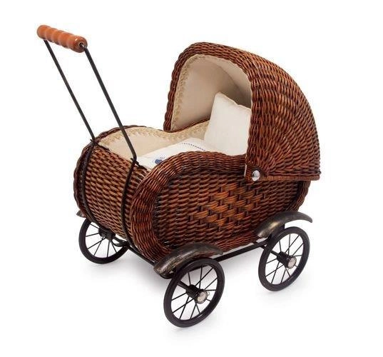 Wiklinowy wózek dla lalek o solidnym splocie w ciemnym, brązowym kolorze to doskonała zabawka dla dziewczynki, która chciałaby zabierać swoje lalki lub misie na spacery.