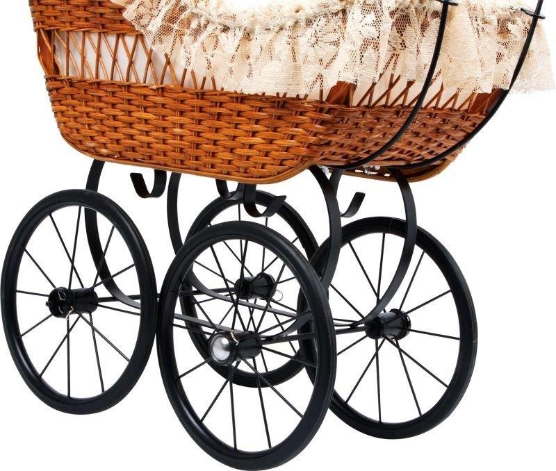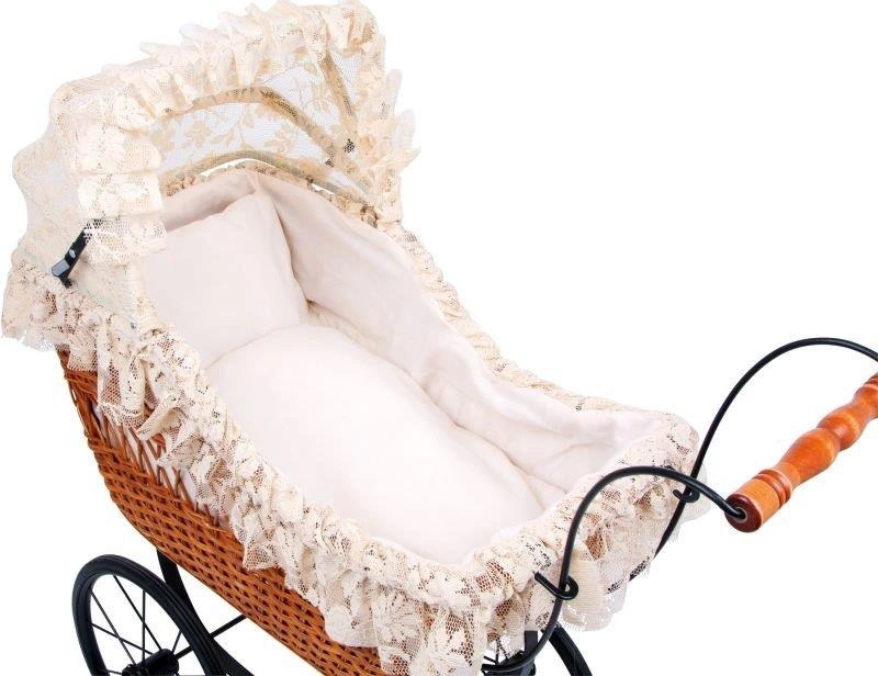 Piękny wiklinowy wózek small foot design łączy w sobie nostalgiczny styl i nowoczesną funkcjonalność. Wyposażony jest w duże, szprychowe koła z gumowymi oponami, metalowe mocowania pod wózkiem, które zapewniają stabilność oraz metalową rączkę z drewnianym uchwytem na wysokości 57 cm. Dodatkowo wnętrze wózka obszyte jest materiałem koronkowym, który dodaje uroku całości. Do wózka dołączone są kołderka i poduszka, które uprzyjemnią sen lalkom i misiom.