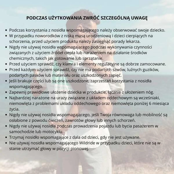 Wildride to holenderska marka stworzona z myślą o aktywnych i stylowych rodzicach, którzy chcą spędzać czas z dziećmi na świeżym powietrzu. Twórcy marki bawiąc się na plaży, spacerując po lasach lub mieście zdali sobie sprawę, że zapewnienie dziecku bezpiecznego i wygodnego sposobu odpoczynku podczas przygód jest niezbędne. Jednocześnie z zaskoczeniem odkryli, że chociaż wiele nosidełek jest przeznaczonych dla niemowląt, żadne nie zaspokaja potrzeb żądnych przygód małych odkrywców. Dzieci, które chcą biegać, bawić się i zwiedzać, ale potrzebują od czasu do czasu krótkiej przerwy na rękach rodziców. I tak powstały nosidła wspomagające Wildride. Wildride spełnia wszelkie wytyczne w zakresie bezpieczeństwa i niezawodności - nosidła zostały przetestowane przez firmę SGS zgodnie z normą certyfikacyjną ASTM F2907-22 i CEN/TR 16512-2015. 90% użytych materiałów posiada certyfikat OEKO-TEX Standard 100.