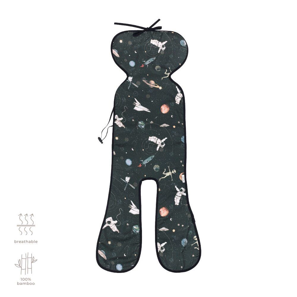 Jedna strona wkładki wykonana jest ze 100% tkaniny bambusowej, druga z dzianiny dystansowej. Wkładka posiada w górnej części gumkę i troczki służące do przymocowania jej do fotelika, tak by była bezpieczna i nie przemieszczała się podczas jazdy.