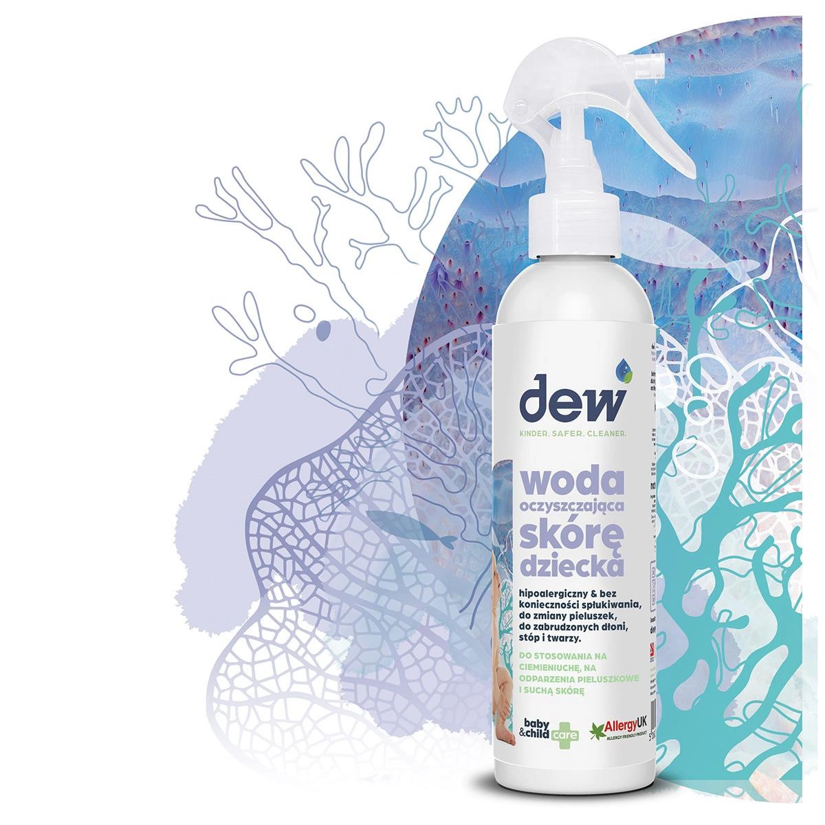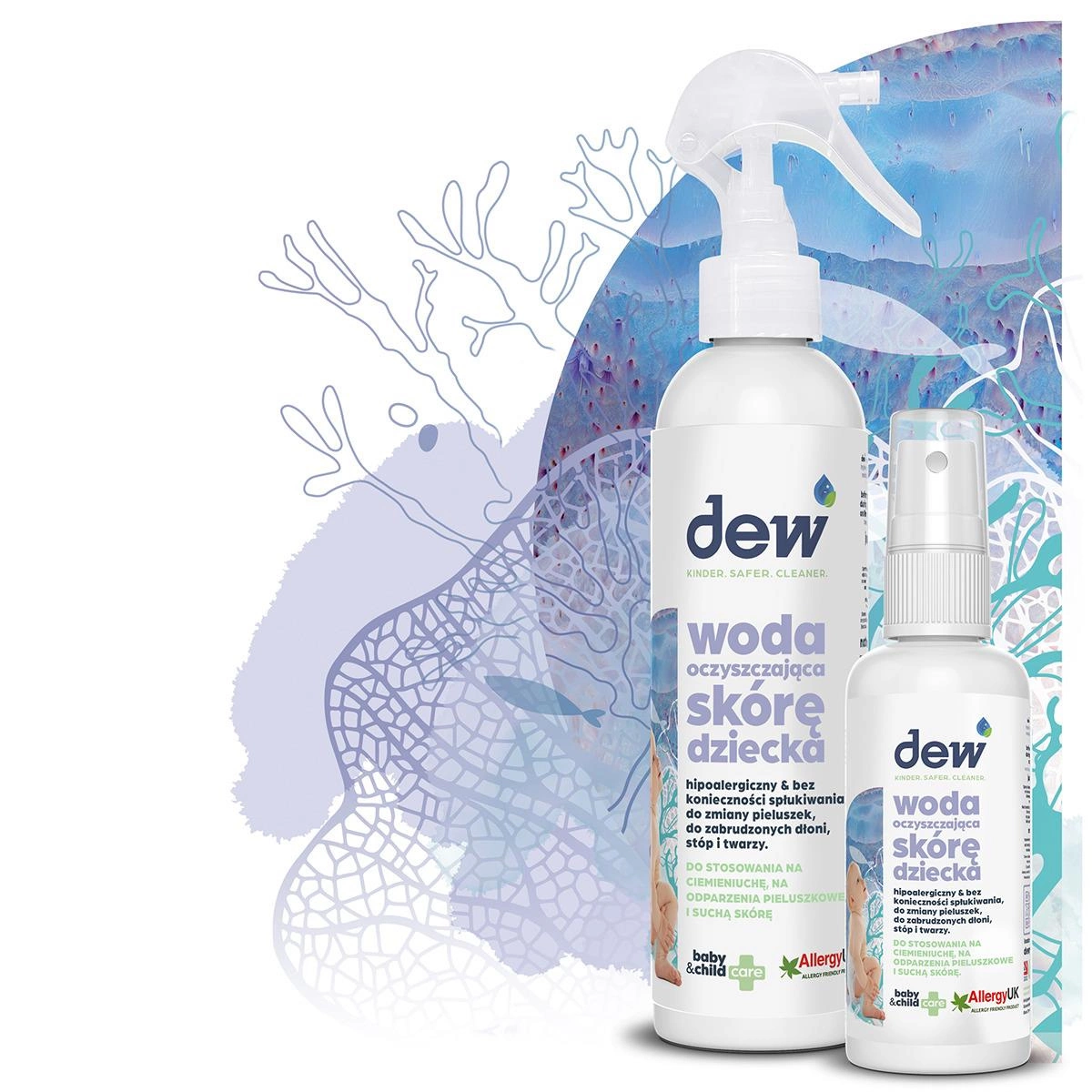 Woda oczyszczająca skórę dziecka to hipoalergiczny, antybakteryjny środek do mycia skóry, który wykorzystuje elektrolizowaną wodę, sól i naukę, aby wytworzyć tę samą substancję, którą natura tworzy w naszym organizmie, aby zwalczać infekcje i zapewniać nam bezpieczeństwo – kwas podchlorawy (HOCl). Środek wolny jest od alkoholu, parabenów, substancji zapachowych i barwników, tak naprawdę nie zawiera żadnych dodatków chemicznych, dlatego jest hipoalergiczny, niedrażniący, ma pH zgodne ze skórą, jest przyjazny dla wegan i delikatny dla delikatnej skóry dziecka. Dew Baby jest również bezpieczny dla dzieci cierpiących na odparzenia pieluszkowe, ciemieniuchę i egzemę dziecięcą.