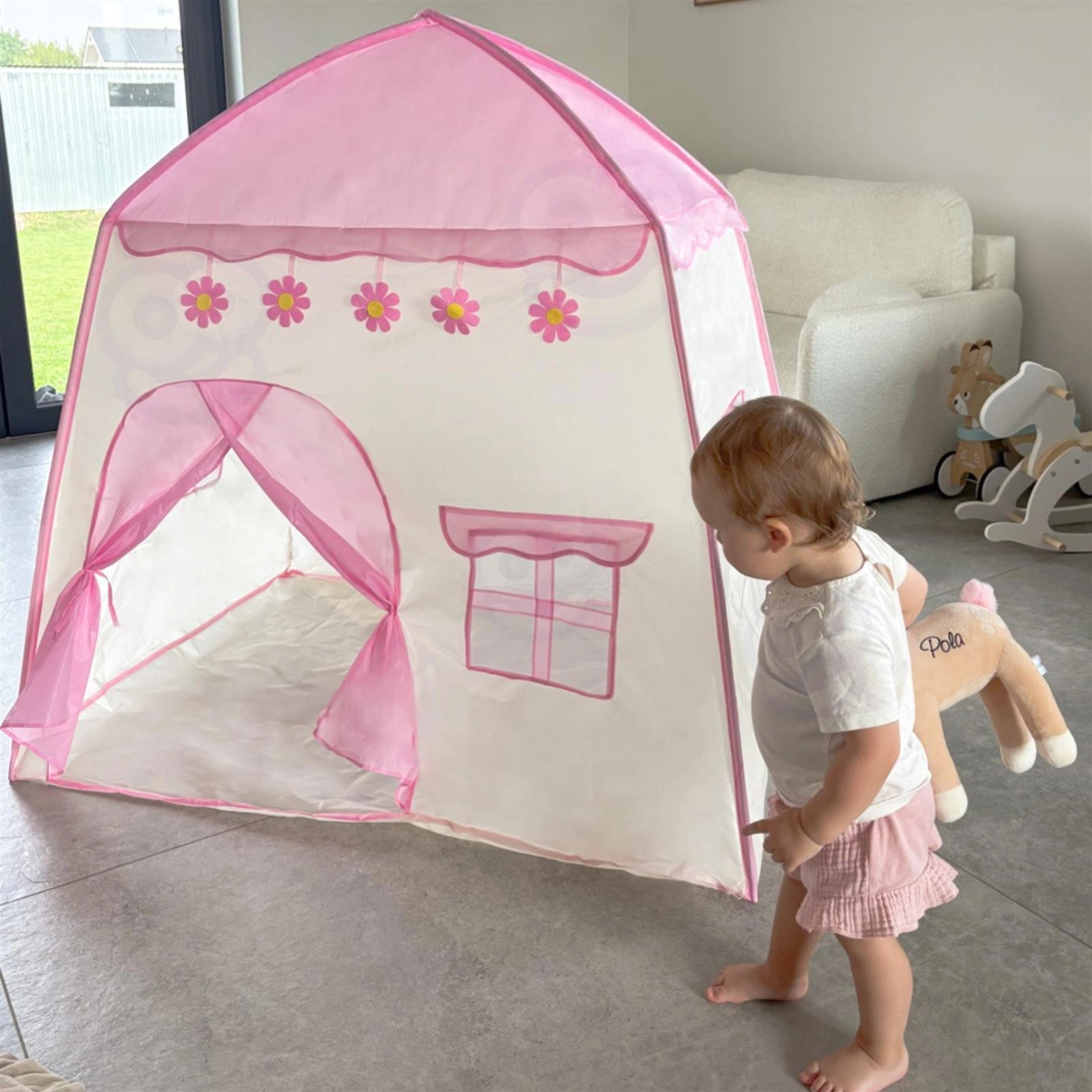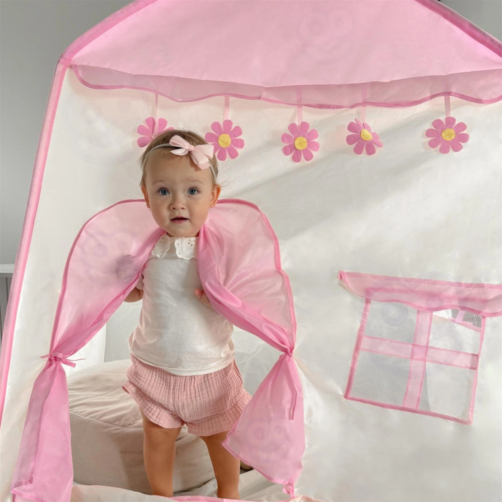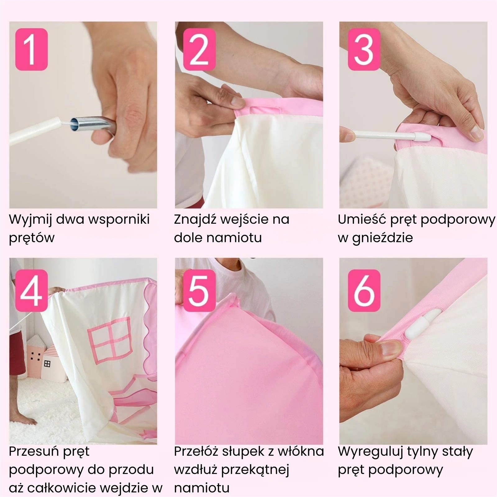 - ✔️ Namiot w kształcie domku w delikatnym odcieniu różu, który idealnie wpasuje się w wystrój pokoju każdej dziewczynki