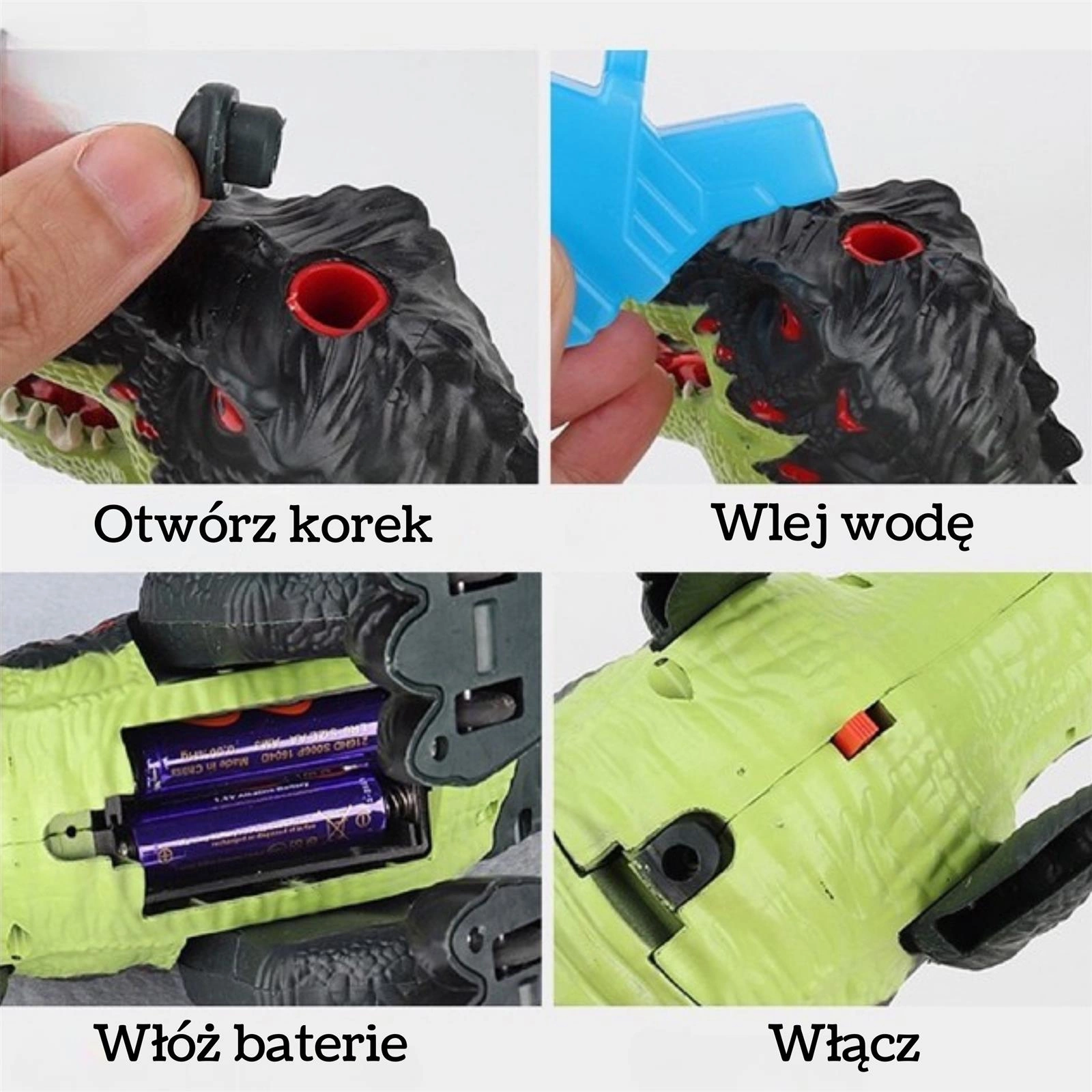 - - Dinozaur chodzi do przodu, porusza łapami i zieje "ogniem"