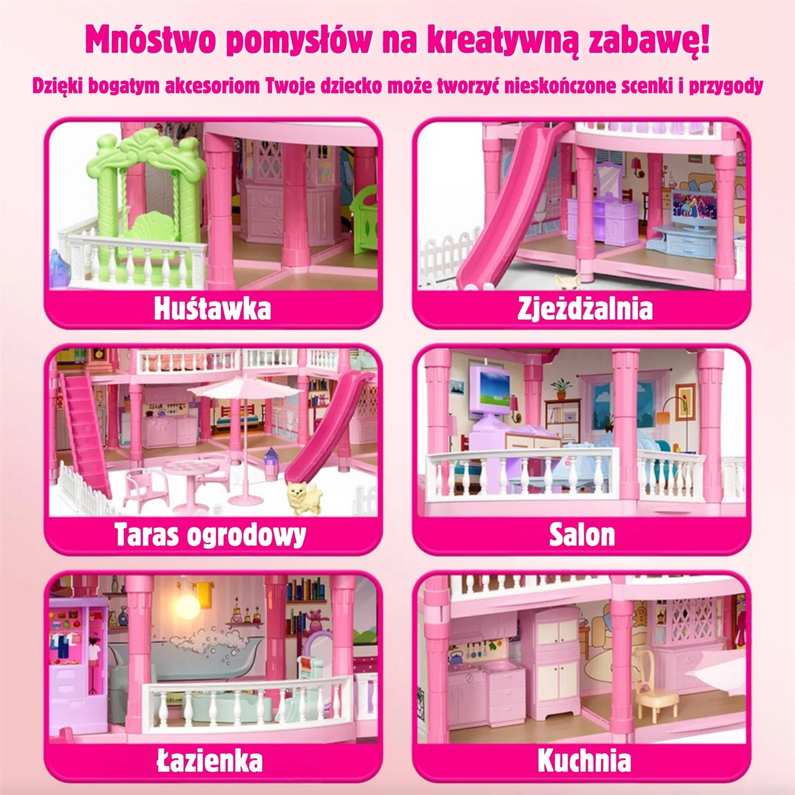Poznaj wspaniały, trzypiętrowy domek dla lalek z różowym dachem, który stanie się ulubionym miejscem zabawy Twojego dziecka! Ta piękna willa o imponujących wymiarach została zaprojektowana z dbałością o każdy szczegół, co sprawia, że wygląda jak prawdziwy dom. Zestaw zawiera aż 296 elementów do złożenia, w tym bogate wyposażenie wnętrza i urocze mebelki, które pozwolą małej projektantce na samodzielne zaaranżowanie każdego z pomieszczeń. To idealna zabawka, która rozwija kreatywność, wyobraźnię oraz umiejętności manualne. W zestawie znajduje się wszystko, co potrzebne, aby stworzyć wymarzony dom dla lalek: od mebelków, przez akcesoria, aż po uroczą lalkę-mieszkankę. Zabawa w dom nigdy nie była tak realistyczna i wciągająca! Zjeżdżalnia, schody i taras to dodatkowe elementy, które urozmaicą zabawę i pozwolą na odgrywanie wielu scenariuszy. Dzięki solidnej konstrukcji domek zapewnia długie godziny fantastycznej i bezpiecznej zabawy.