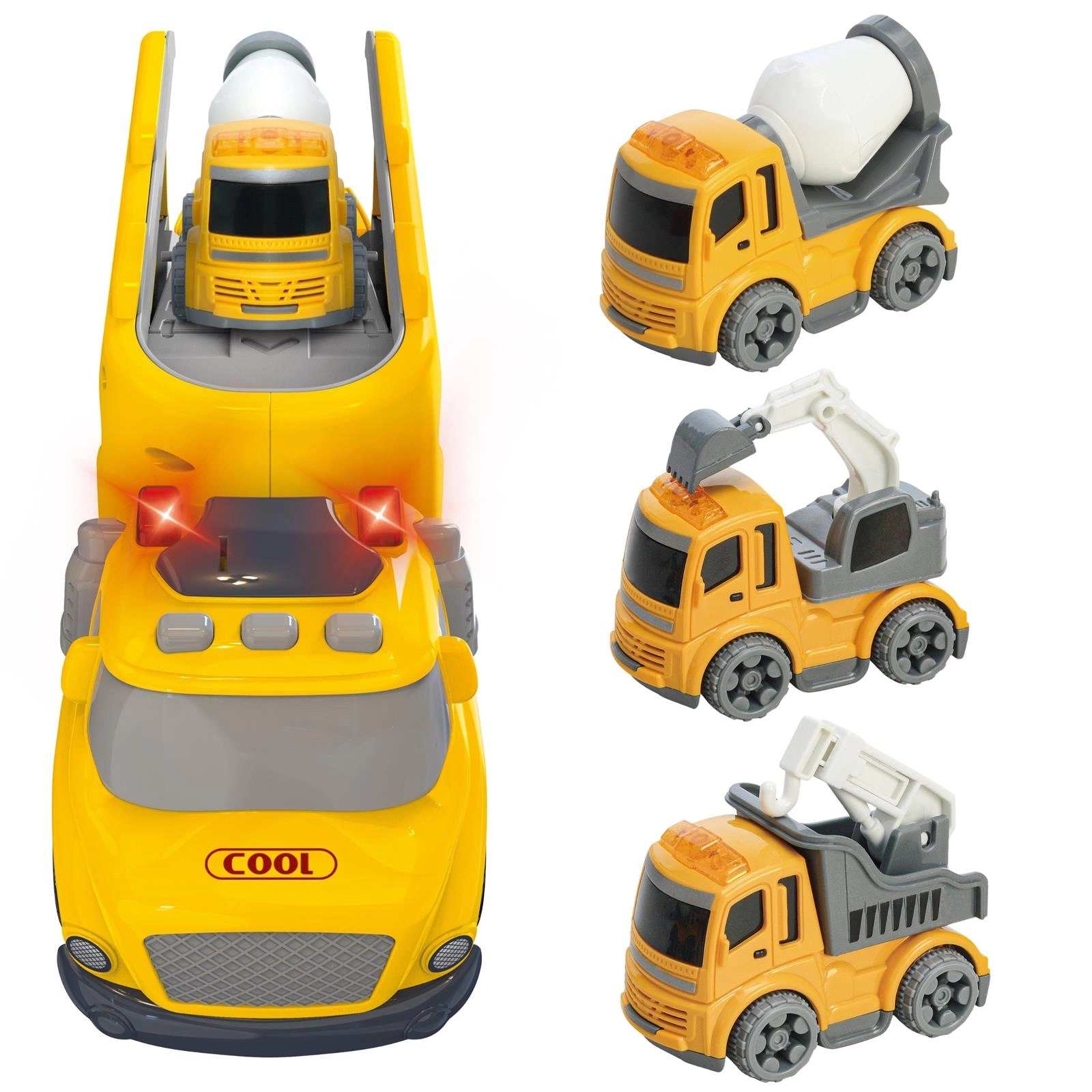 Laweta Construction Truck z serii CITY TRUCK to idealna zabawka dla każdego małego fana motoryzacji i miejskich pojazdów specjalnych. W skład zestawu wchodzi żółta laweta przewożąca małe pojazdy budowlane. Zabawka została wykonana z trwałego tworzywa sztucznego, wyposażona w efekty świetlne i dźwiękowe, które aktywują się po naciśnięciu przycisku na dachu pojazdu.