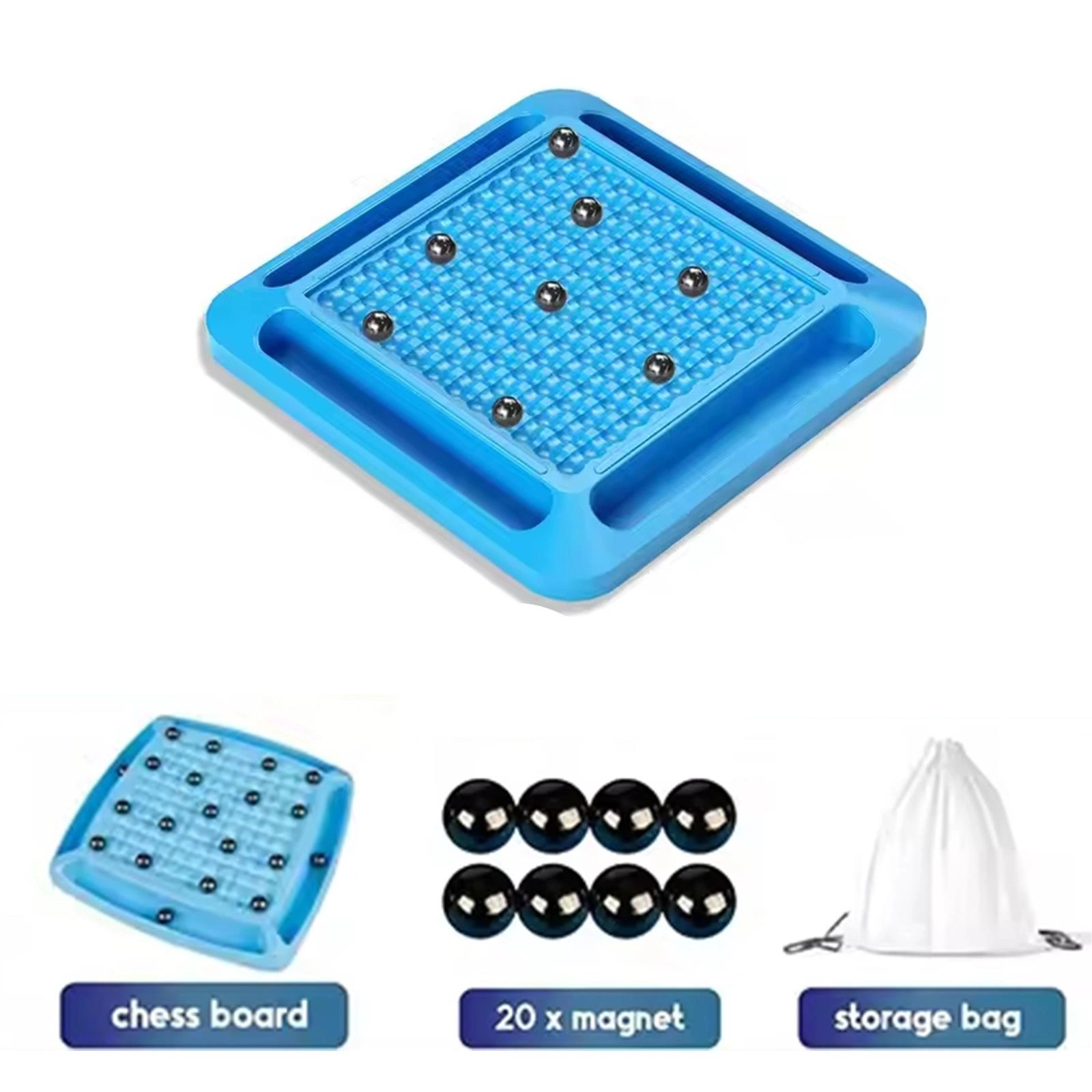 - Zestaw zawiera: 20 magnetycznych kulek, planszę do gry, z 4 półeczkami na magnesy, woreczek na kulki.