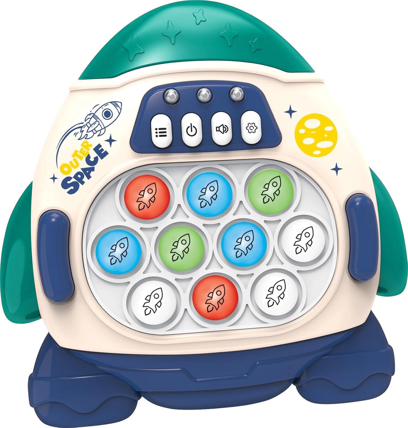 Gra POP IT Rakieta to zabawka antystresowa, która sprawdzi się już dla najmłodszych. Gra wydaje radosne dźwięki, które zachęcają dzieci do zabawy i urozmaicają rozgrywkę. Zabawka jest niewielka więc, sprawia, że możemy zabrać ją ze sobą. Pop It sprawia frajdę dzieciom oraz dorosłym, którzy chętnie po nią sięgają. Rozwija umysł, zdolności manualne, koordynację wzrokowo-ruchową oraz trenuje spostrzegawczość i pomaga w walce ze stresem.