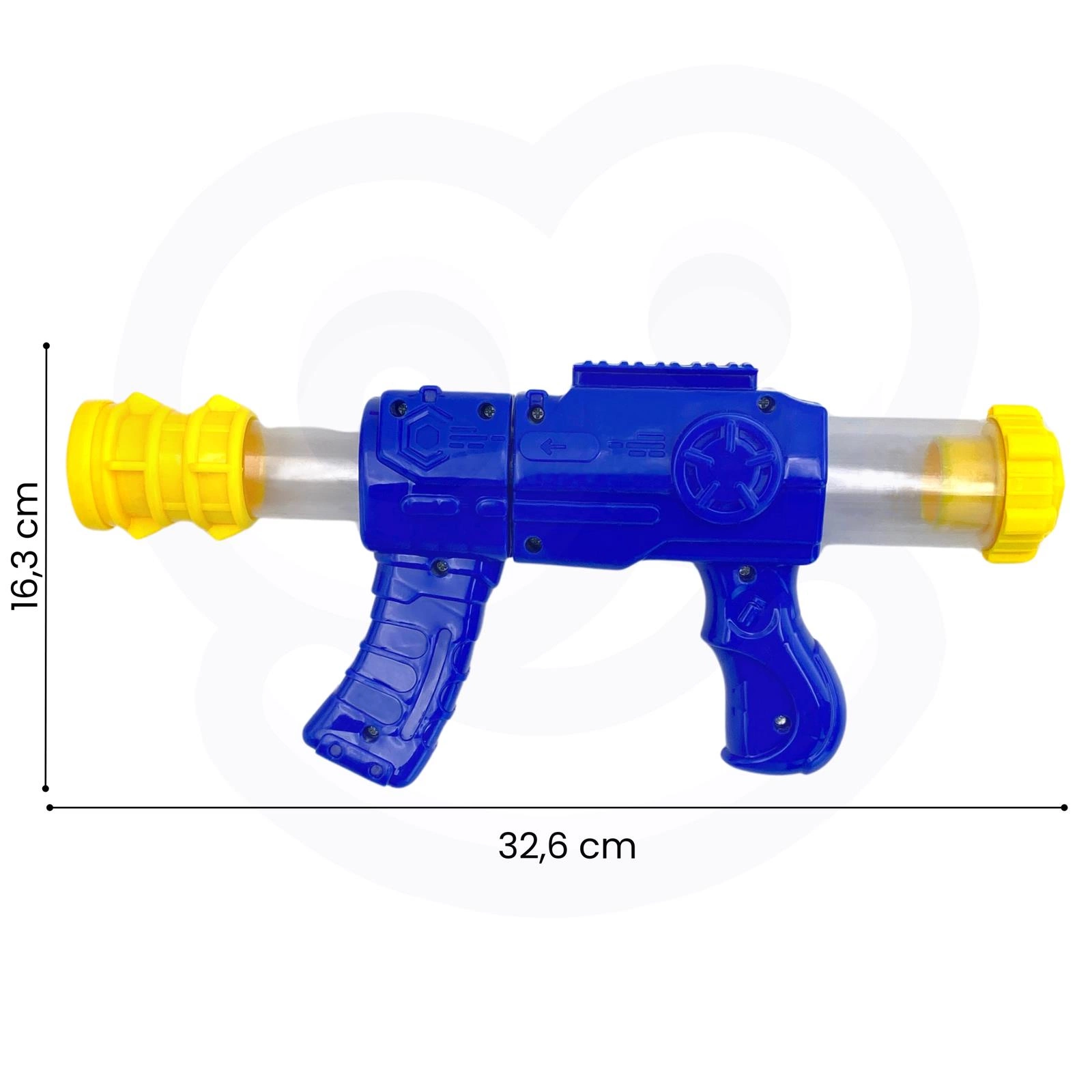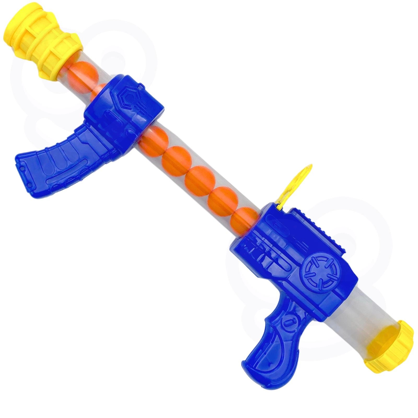 - - pistolet jest zasilany powietrzem, wystarczy więc docisnąć kolbę do siebie po czym odepchnąć ją, a piłeczka wystrzeli