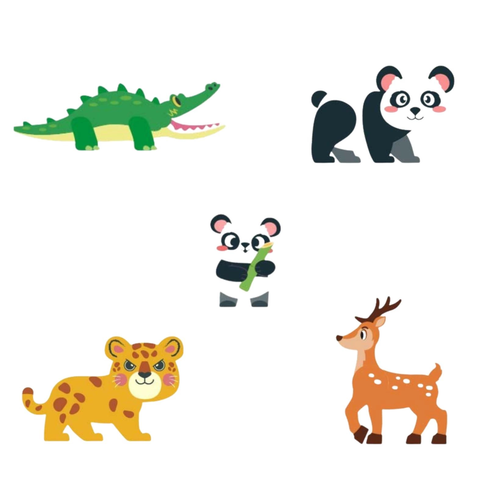 - - Figurki zwierząt: 2 x panda, lampart, jeleń, krokodyl.