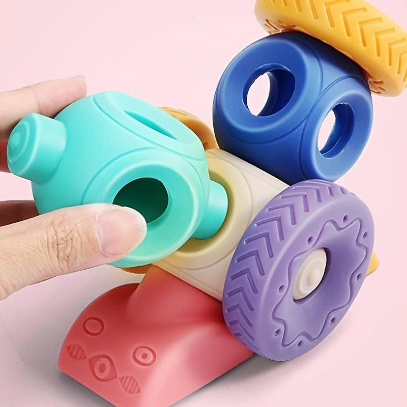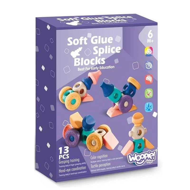 WOOPIE Układanka Klocki Sensoryczne zaciekawią każdego malucha. Dzięki ciekawym kształtom i kolorom doskonale stymulują rozwój koordynacji wzrokowo-słuchowej, motorycznej dziecka oraz zmysłu dotyku. Klocki posiadają wypukłe kształty z teksturami/wzorami i kształtami geometrycznymi. Dodatkowo klocki można ze sobą łączyć i budować różnie konstrukcje np. wyścigówkę. Klocki są miękkie i przyjemne w dotyku. Dzięki swojej budowie sprawdzą się również doskonale jako gryzak. Można używać i myć w wodzie. Produkt w pięknej stonowanej kolorystyce przeznaczony dla dzieci od 6 miesiąca życia.
