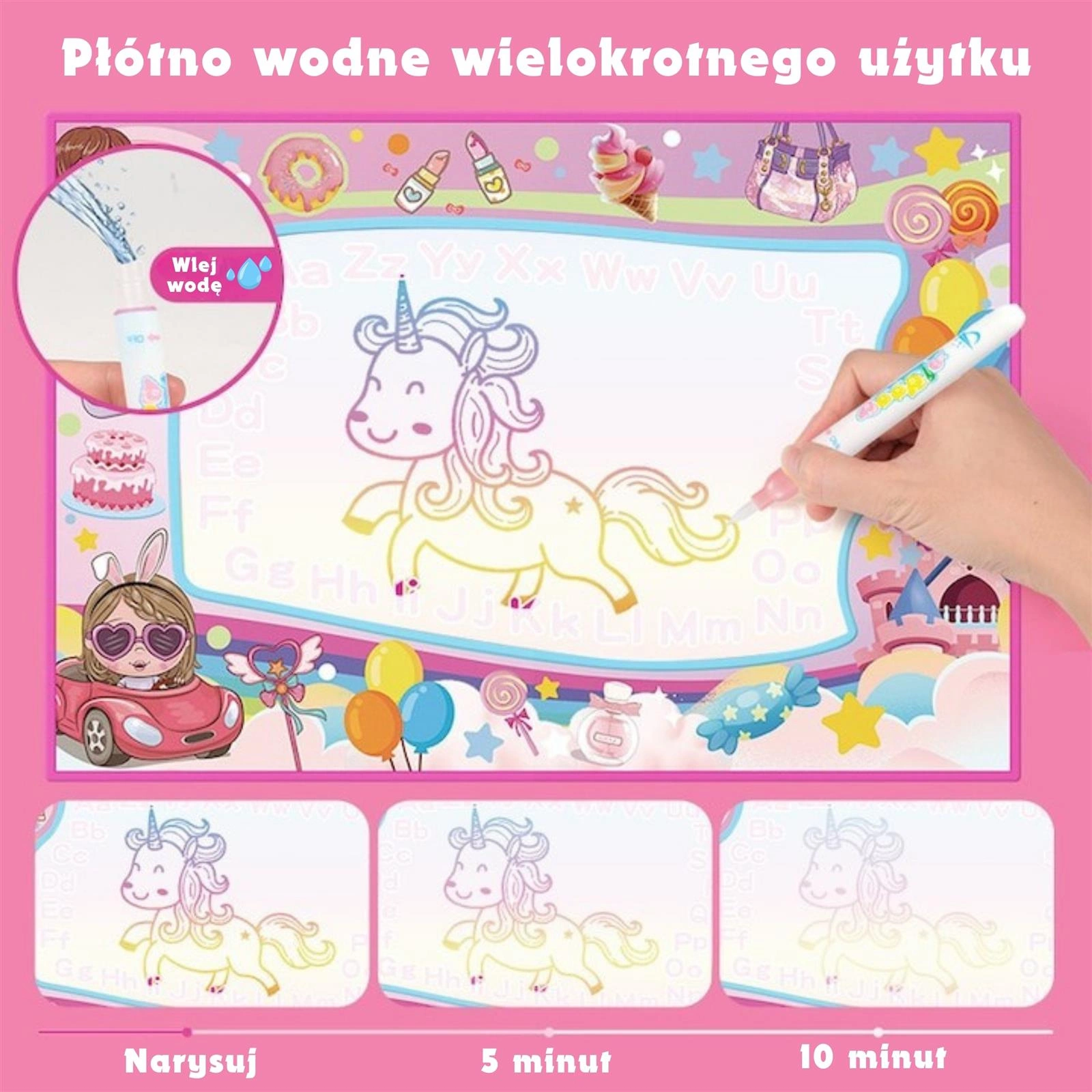 Rozpal wyobraźnię dziecka dzięki wielofunkcyjnej Macie Wodnej 2w1 marki Woopie! Ta wyjątkowa mata do rysowania łączy w sobie funkcje malowanie wodą oraz rysowanie światłem UV. Po kilku minutach rysunki stopniowo znikają, dając dziecku możliwość tworzenia nowych dzieł bez końca. Bajkowy dziewczęcy motyw pełny balonów, jednorożców, zamków i gwiazd przeniesie dziecko w magiczny świat kreatywnej zabawy. Wystarczy trochę wody by stworzyć kolorowe arcydzieła – bez tuszu, bez brudu, bez ryzyka zniszczeń. Idealna do zabawy solo lub z rodzeństwem, przyjaciółmi czy rodzicami. Mata poprawia zdolności manualne, koordynację ręka-oko i jest świetnym sposobem na naukę przez zabawę. Można z niej korzystać zarówno w domu jak i w ogrodzie.