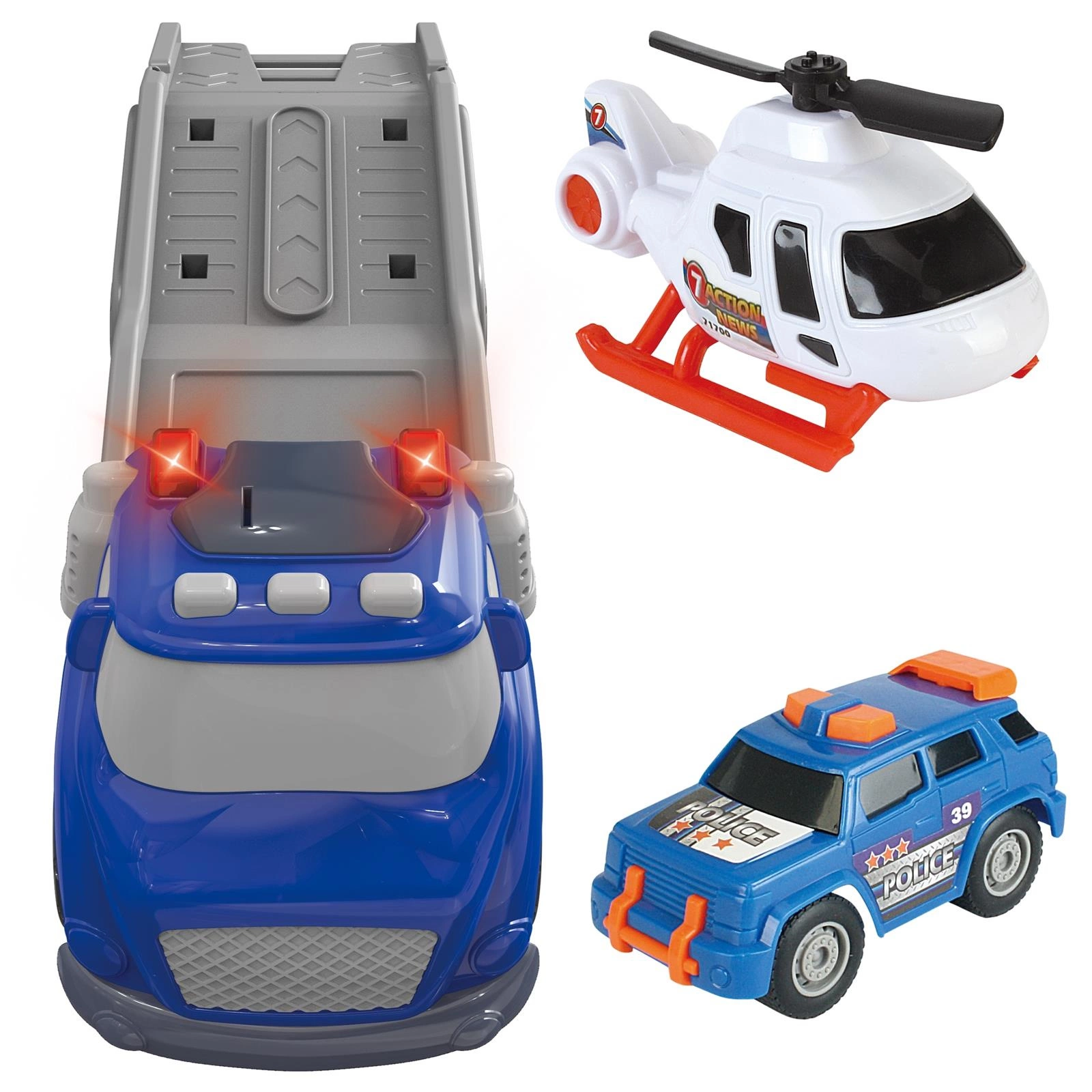 Laweta Police Truck z serii CITY TRUCK pozwoli Twojemu dziecku przenieść się w świat policyjnych przygód i wcielić się w rolę stróża prawa. Wykonany z wysokiej jakości materiałów zestaw składa się z dużej niebieskiej ciężarówki z lawetą, helikoptera oraz samochodu terenowego. Efekty świetlne i dźwiękowe sprawią, że zabawa stanie się jeszcze bardziej realistyczna i emocjonująca. To idealny zestaw do kreatywnej zabawy w domowy komisariat lub akcje ratunkowe.
