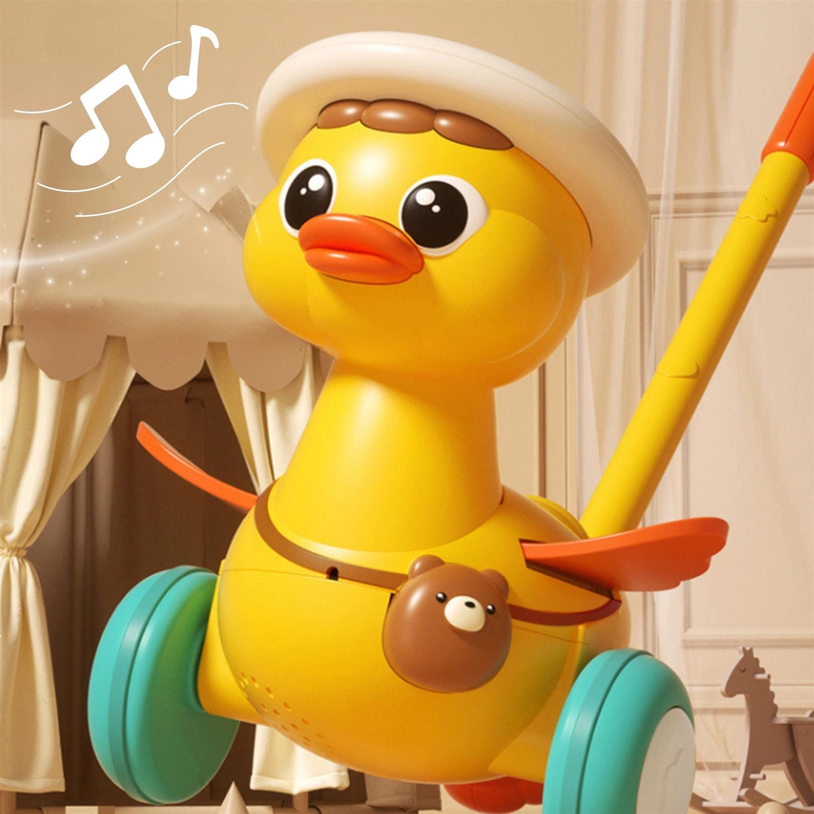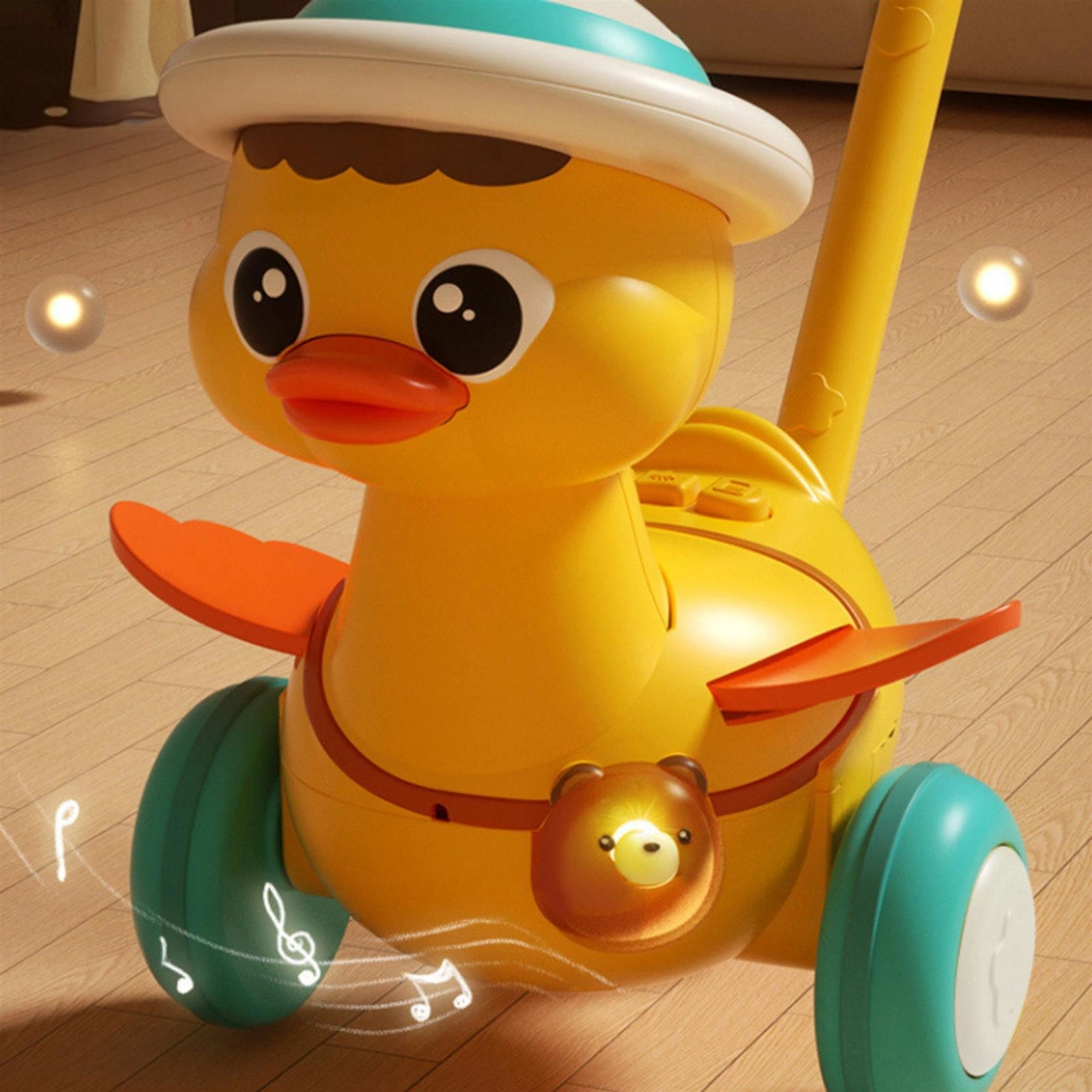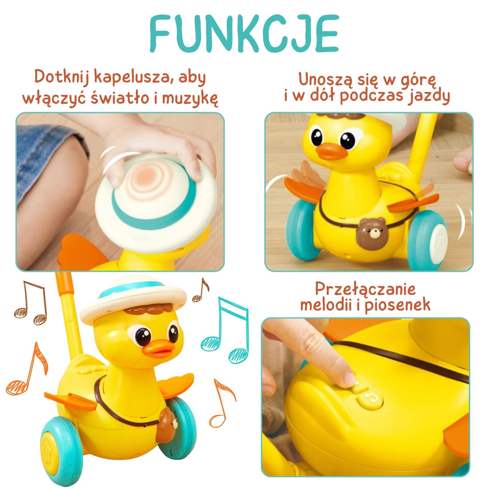 Radosna kaczuszka na kiju marki Woopie zaprasza do pierwszych spacerów. Macha skrzydełkami, świeci i gra wesołe melodie, zamieniając każdy krok w małą przygodę pełną ruchu i śmiechu. Dzięki lekkiej konstrukcji i stabilnym kółkom maluch chętnie pcha ją po domu, a intuicyjne przyciski zachęcają do samodzielnej zabawy i odkrywania dźwięków.