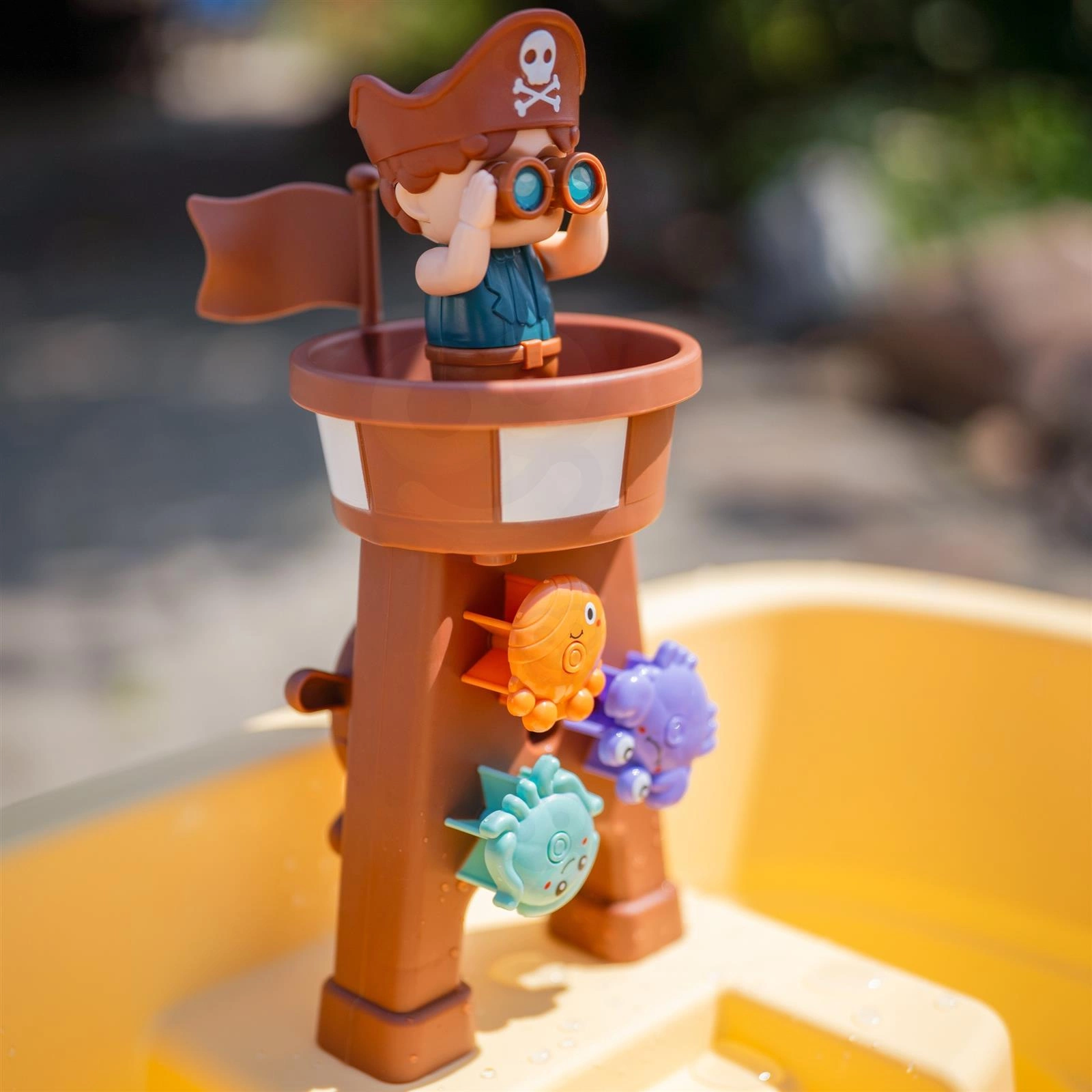 Stolik Wodny Piracka Łódź marki Woopie to niezwykła zabawka, która przenosi dzieci w świat pirackich przygód i zapewnia godziny kreatywnej zabawy na świeżym powietrzu. Dzięki bogatemu zestawowi kolorowych akcesoriów, ruchomym elementom i pirackiej wieży maluchy mogą eksperymentować z wodą, bawić się bąbelkami, kręcić kołem wodnym i odkrywać mnóstwo możliwości zabawy. Dołączony parasol pozwoli na komfortową zabawę w nawet najgorętsze dni. Prosta, solidna konstrukcja oraz duże rozmiary sprawiają, że stolik jest wygodny i atrakcyjny nawet dla kilku dzieci jednocześnie.