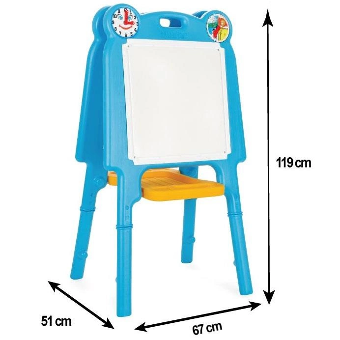 Tablica jest dwustronna. Z jednej strony znajduje się liczydło, dzięki któremu dziecko może nauczyć się podstaw matematyki. Z drugiej strony znajduje się tablica do pisania i rysowania ścieralnymi pisakami. Na niej dziecko może uwolnić swoją wyobraźnię. Od teraz każdy mały artysta będzie mógł tworzyć własne arcydzieła. Po obu stronach znajdują się dwa różne zegarki, które pozwolą dziecku zapoznać się ze zjawiskiem czasu. Pod tablicą znajduje się wygodna półeczka na której dziecko może przechowywać potrzebne przybory w czasie zabawy i nauki.