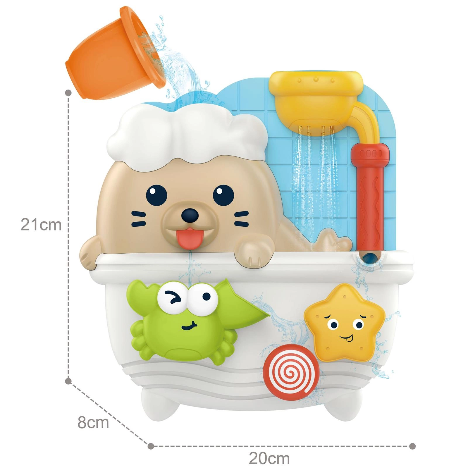 Zabawka do kąpieli Foka w Wannie od marki WOOPIE zapewni ciekawy czas dla dziecka podczas kąpieli. Dziecko za pomocą kubeczka wlewa do czapki foki lub do prysznica wodę. Podczas wlewania wody w zależności od miejsca nalewania będzie kręcić się gwiazdka lub poruszać krab. Dodatkowo na plecach posiada 3 przyssawki, dzięki czemu można przyczepić ja do ściany w łazience lub do wanny. Zabawka nie tylko umili czas podczas kąpieli, ale również rozwinie wyobraźnię, zdolności manualne u dziecka oraz rozwinie świadomość otaczającego go świata, a przede wszystkim pozwoli skoncentrować dziecko i zająć podczas mycia.