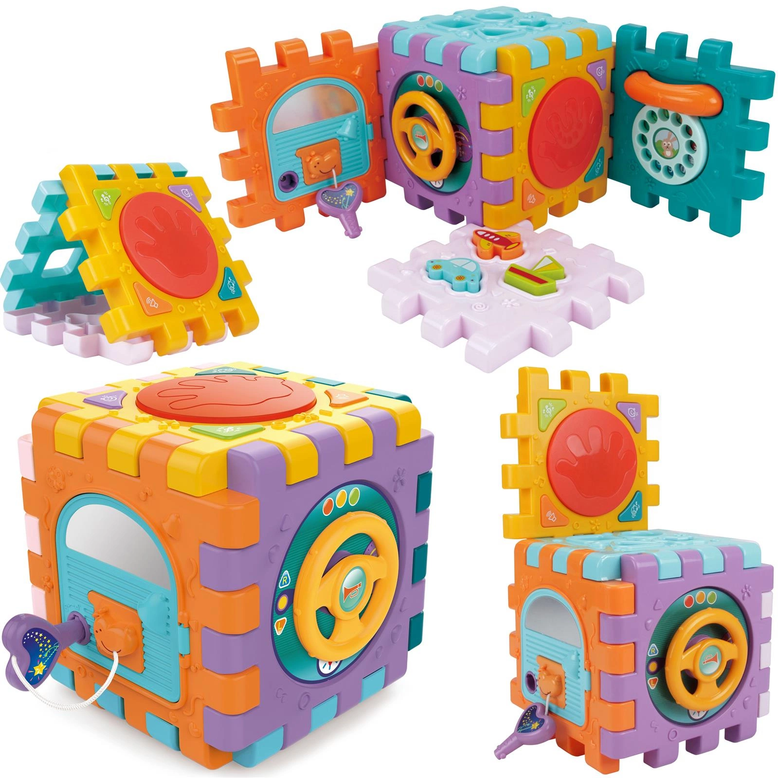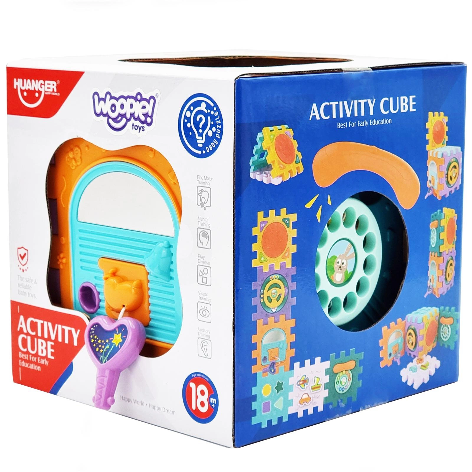 Zestaw Zabawek Sensorycznych od marki WOOPIE rozwinie od urodzenia zdolności Twojego dziecka. Zabawka posiada 6 ścian z różnymi aktywnościami. Wszystkie bazują na rozwinięciu zmysłu dotyku i słuchu u dziecka. Mamy m.in sorter, drzwi i zamek, telefon, układankę i guziki z dźwiękami. Kostkę można rozłożyć na pojedyncze elementy i ułożyć np w trójkąt. Zestaw, który będzie kluczowy w rozwoju w wielu aspektach Twojego dziecka na początkowym etapie życia!