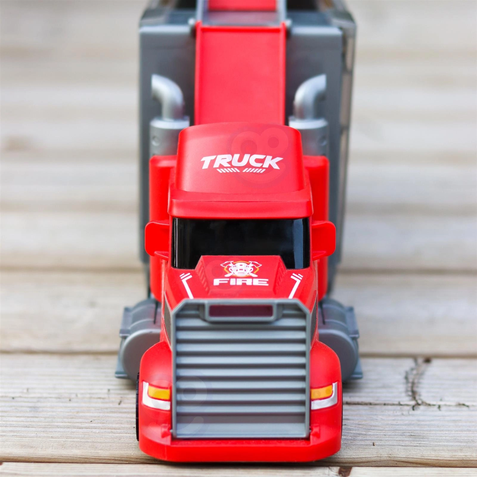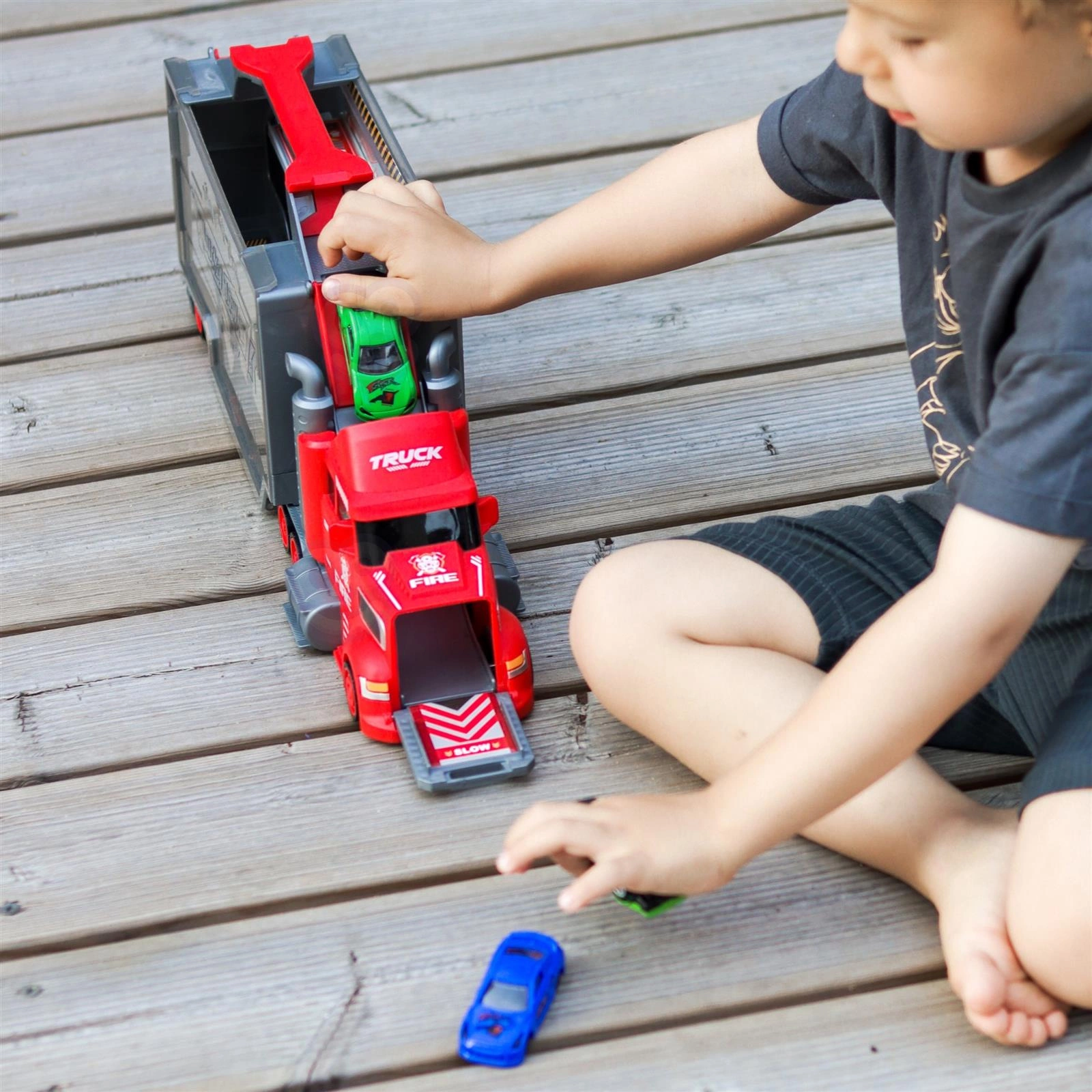 Oto niezwykle funkcjonalna i pełna emocjonującej zabawy ciężarówka strażacka z funkcją garażu i wyrzutni aut marki Woopie, która zaskoczy każdego małego fana motoryzacji! Ta transformująca się ciężarówka w jednej chwili może pełnić rolę klasycznej lawety transportowej, a po rozłożeniu zamienia się w rozbudowany tor wyścigowy z wyrzutnią samochodzików! Po otwarciu naczepy i rozłożeniu elementów, użytkownik zyskuje dostęp do garażu oraz toru wyścigowego, na którym można organizować emocjonujące wyścigi i pojedynki samochodowe. Dzięki dołączonym samochodzikom i interaktywnym elementom, dziecko może tworzyć ekscytujące scenariusze i rozwijać kreatywność. Zabawka gwarantuje wiele godzin świetnej zabawy