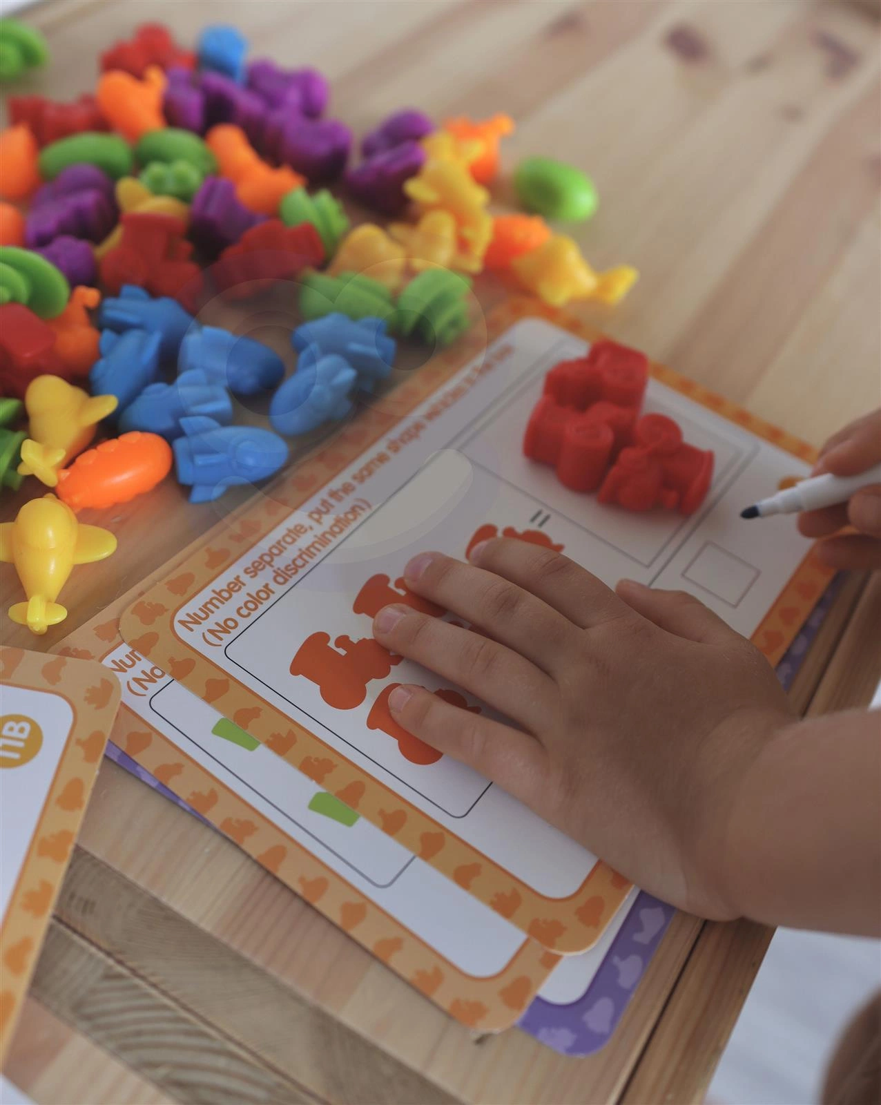 - - zabawa polega na wykonaniu matematycznego ćwiczenia z karty z zdaniami używając do tego figurek oraz pisaka