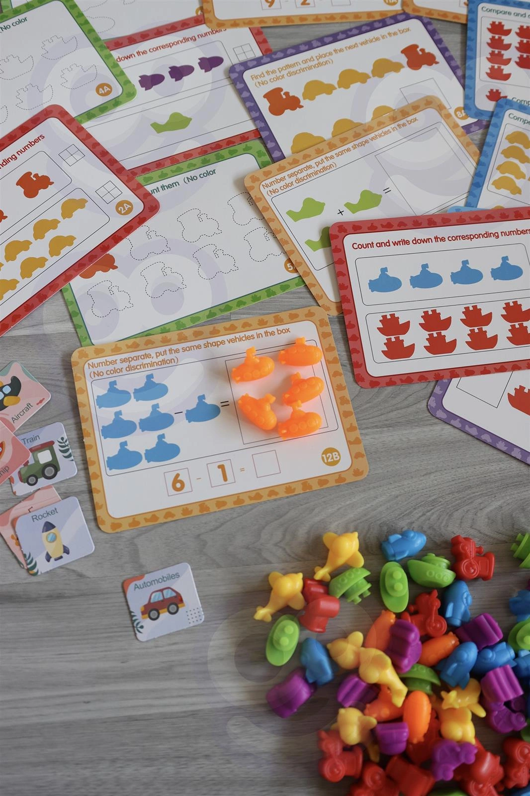 Zestaw Edukacyjny Pojazdy od marki WOOPIE to prosta, ale skuteczna pomoc w nauce i zabawie. Gra polega na wykonaniu matematycznego ćwiczenia z karty z zdaniami używając do tego figurek oraz pisaka. Przykładowym zadaniem jest m.in.: znalezienie wzoru i umieszczenie na nim odpowiedniego pojazdu oraz policzenie narysowanych pojazdów i napisanie w wyznaczonym miejscu itp. Dodatkowo zabawka ma wiele edukacyjnych możliwości wykorzystania. Poza nauką liczenia, figurki można użyć, również do nauki kolorów. Zabawka rośnie razem z dzieckiem, ponieważ w późniejszych latach dorastania może służyć do nauki języka. Zestaw jest super alternatywą dla standardowego sposobu uczenia - nauka przez zabawę!
