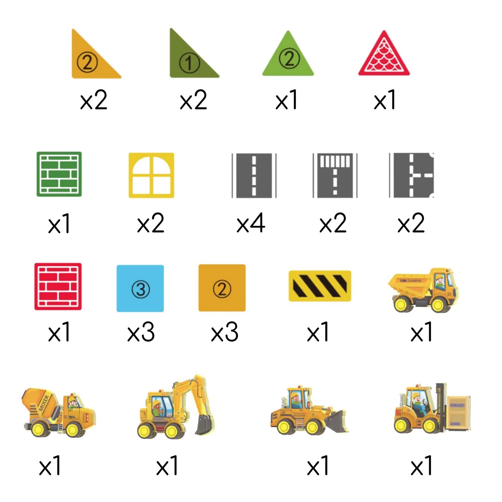 - - 5 × pojazdy budowlane (koparka, spychacz, betoniarka, wywrotka, ładowarka)
