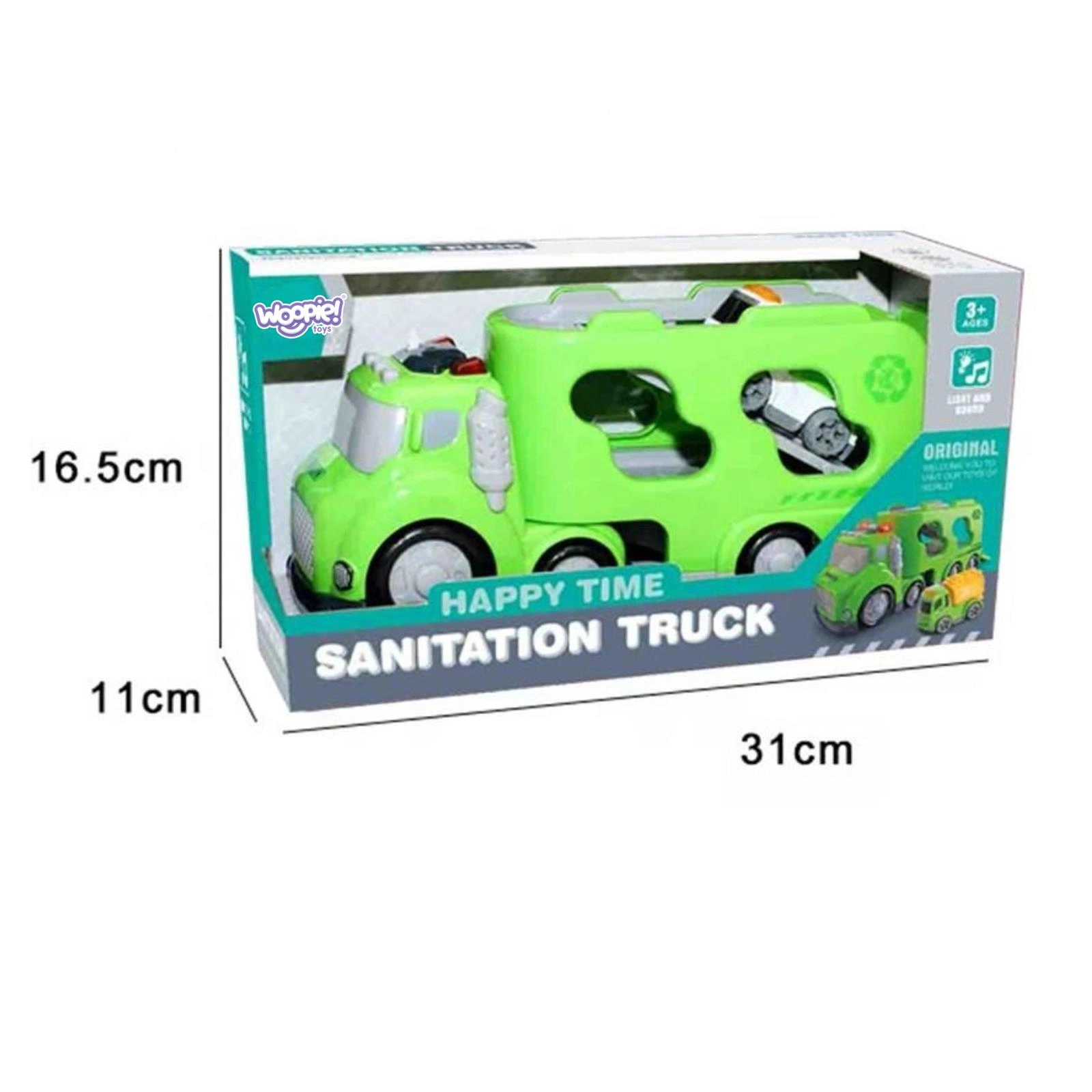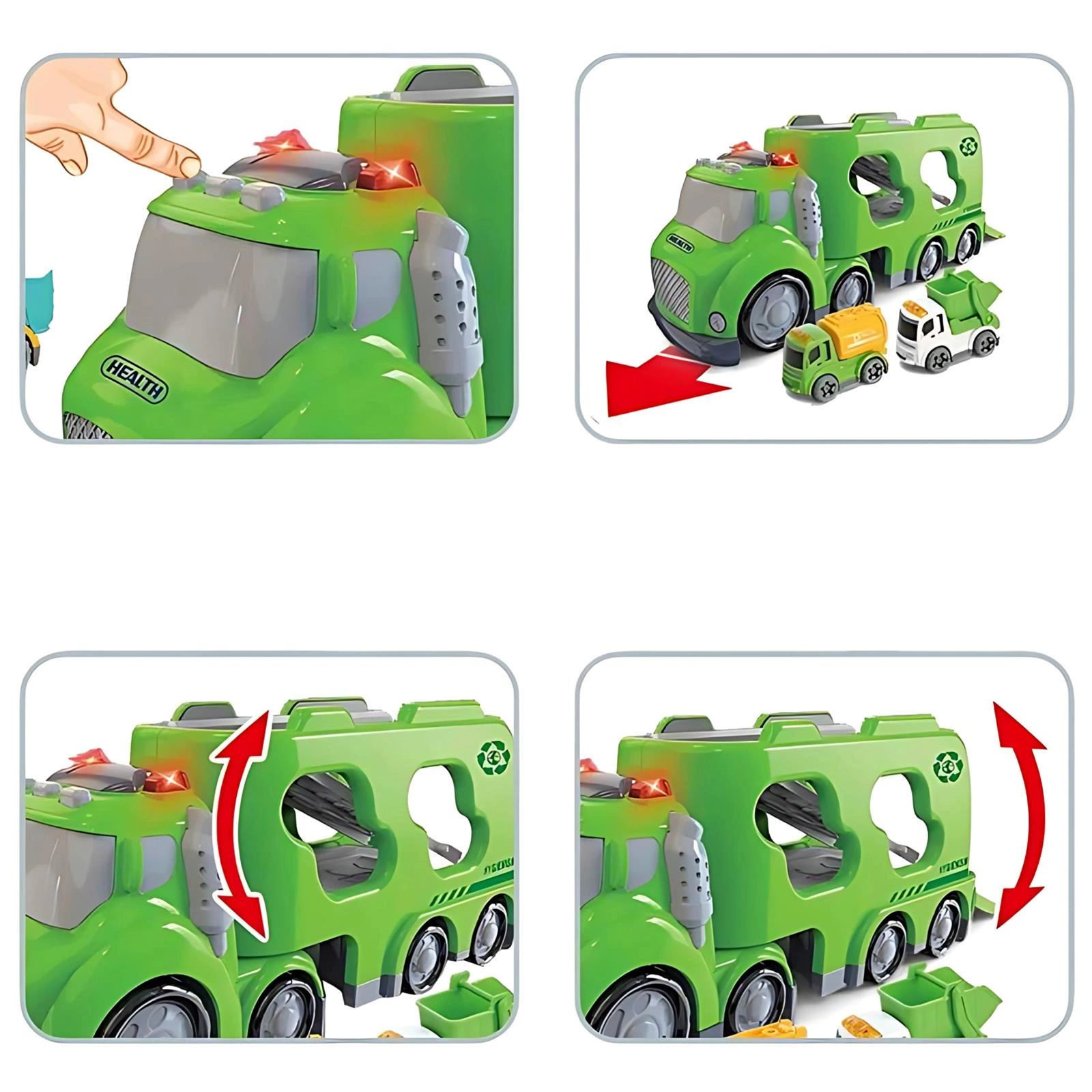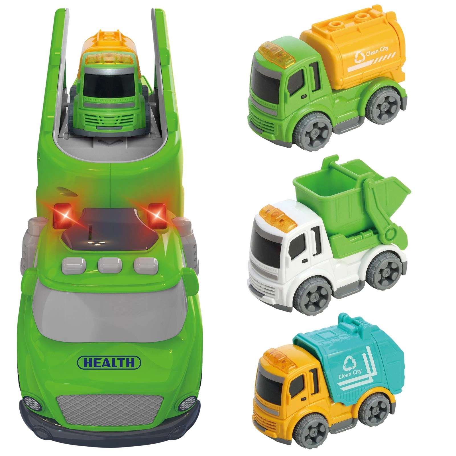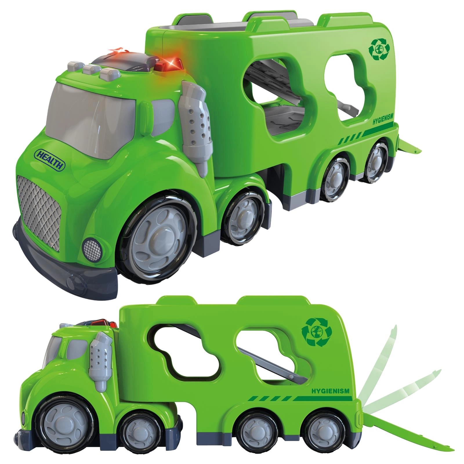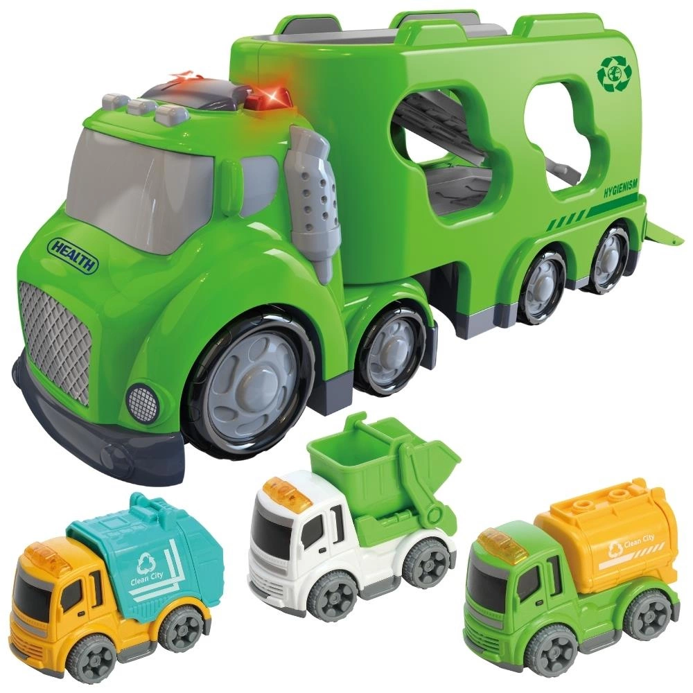 Laweta Sanitation Truck z serii CITY TRUCK to idealna zabawka dla każdego małego fana motoryzacji i miejskich pojazdów specjalnych. W skład zestawu wchodzi zielona laweta przewożąca małe pojazdy utylizacyjne. Zabawka została wykonana z trwałego tworzywa sztucznego, wyposażona w efekty świetlne i dźwiękowe, które aktywują się po naciśnięciu przycisku na dachu pojazdu.