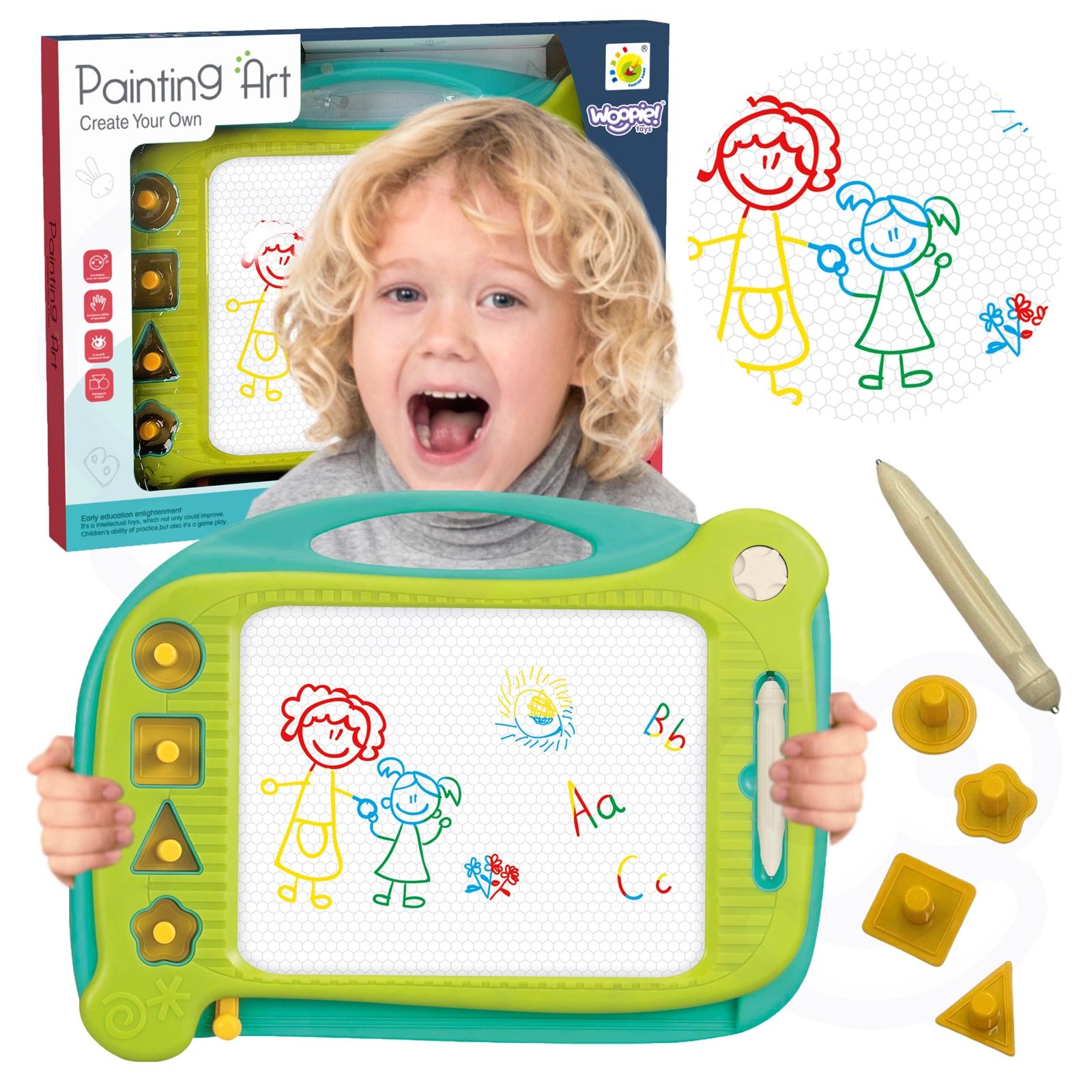 Znikopis Tablica Magnetyczna daje możliwość kreatywnej zabawy na długi czas! Tablica zachęca do pisania i rysowania. Rysowanie pozwoli skoncentrować, wyciszyć i uspokoić Twoje dziecko. Znikopis pozwala na tworzenie nieskończonej ilość obrazków – wystarczy przejechać specjalnym suwakiem, a rysunek zniknie i można rysować od nowa! Zestaw dodatkowo zawiera wygodny magiczny długopis oraz 4 stempelki, które urozmaicą dzieło. Tablica posiada wygodny uchwyt, dzięki czemu dziecko może zabrać ją wszędzie. Znikopis rozwinie u dziecka zdolności manualne, wyobraźnie, kreatywność oraz da szansę na rozwinięcie artystycznej strony dziecka!