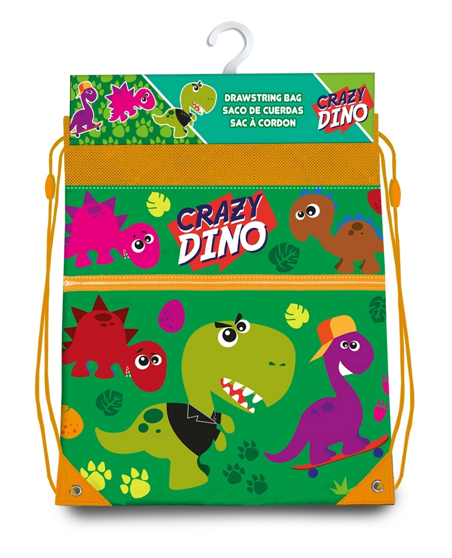 Worek szkolny z motywem Crazy Dino idealny dla dzieci gdy potrzebuja do szkoły, przedszkola zabrać ze sobą obuwie i strój na gimnastykę.