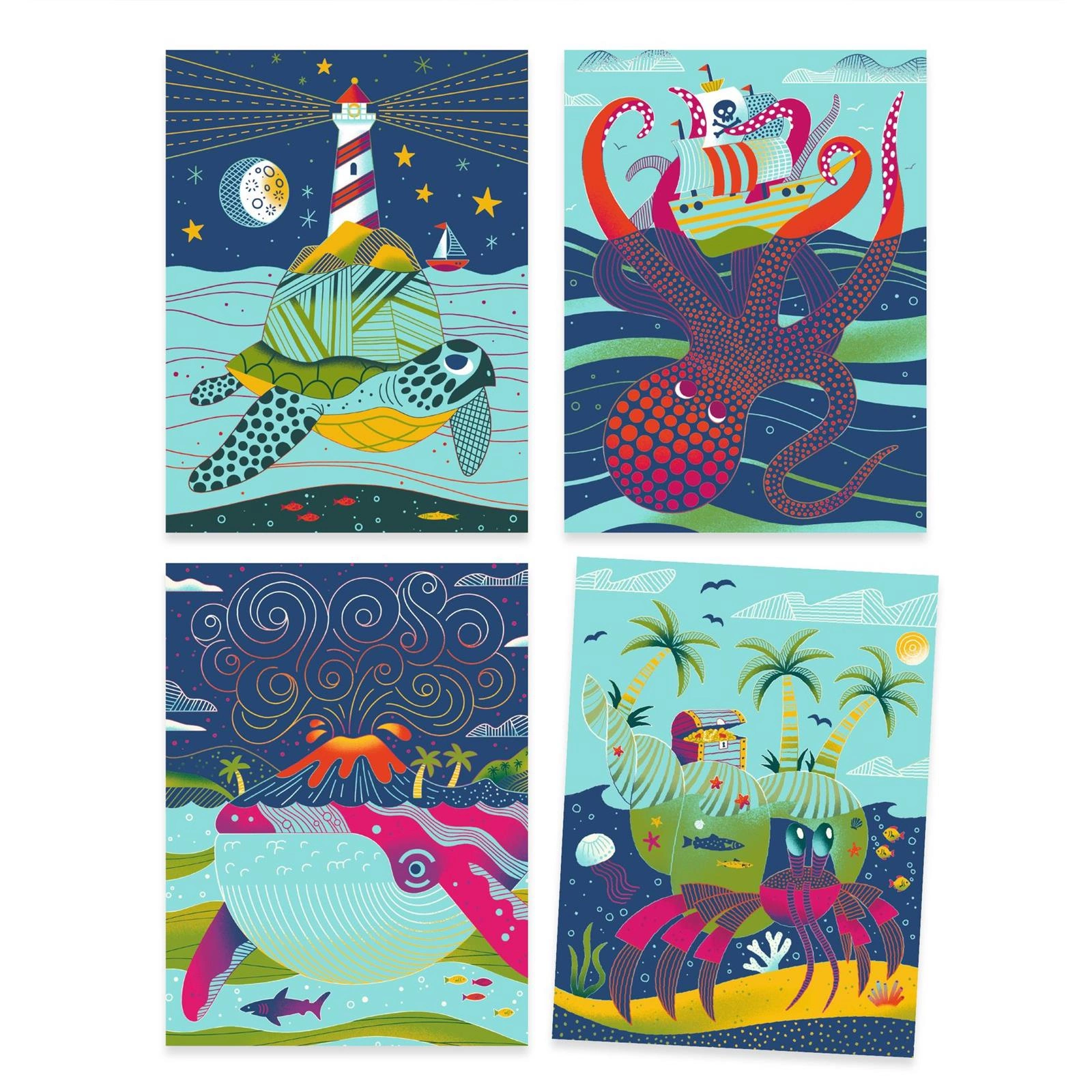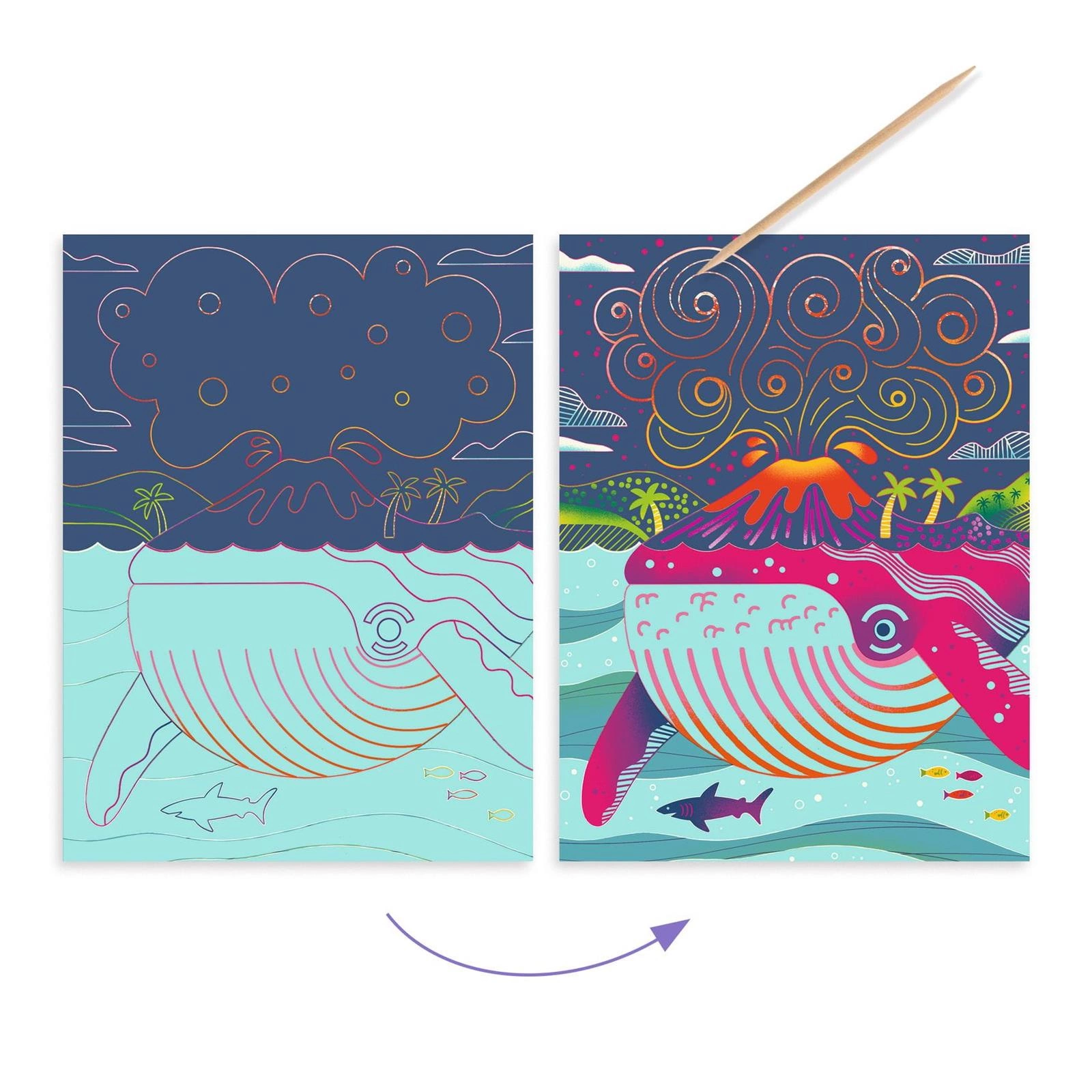 Zestaw 4 kart zdrapek, które ukazują podwodny świat w metaforycznym ujęciu. Po zdrapaniu odpowiednich pól dołączonym do zestawu rysikiem, otrzymamy pięknie ilustrowane obrazki. Instrukcja krok po kroku ułatwi poprawne zdrapywanie według wzoru. Opakowanie wykonane z kartonu posiadającego certyfikat FSC®.
