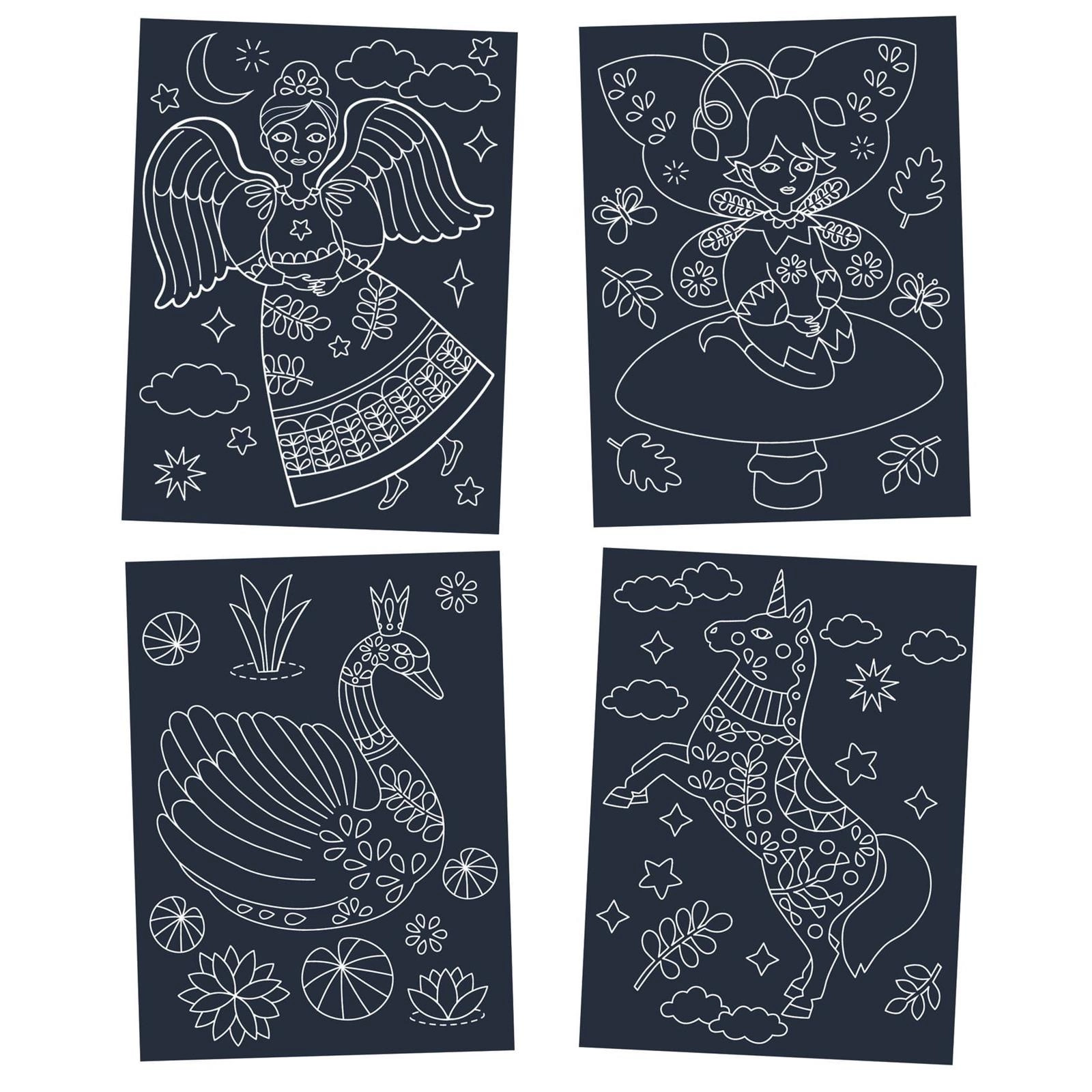 Zestaw 4 kart zdrapek, które ukazują magiczny świat, który świeci w ciemności! Po zdrapaniu odpowiednich pól dołączonym do zestawu rysikiem, otrzymamy pięknie ilustrowane obrazki. Instrukcja krok po kroku ułatwi poprawne zdrapywanie według wzoru. Opakowanie wykonane z kartonu posiadającego certyfikat FSC®.