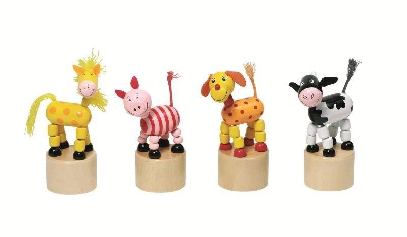 Zwierzęta wyginają się po naciśnięciu na przycisk w podstawie. Nogi i szyja zamocowane są na gumkach.