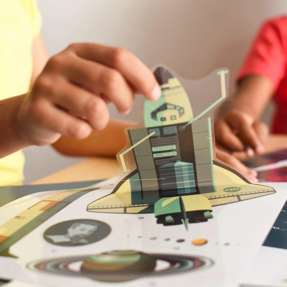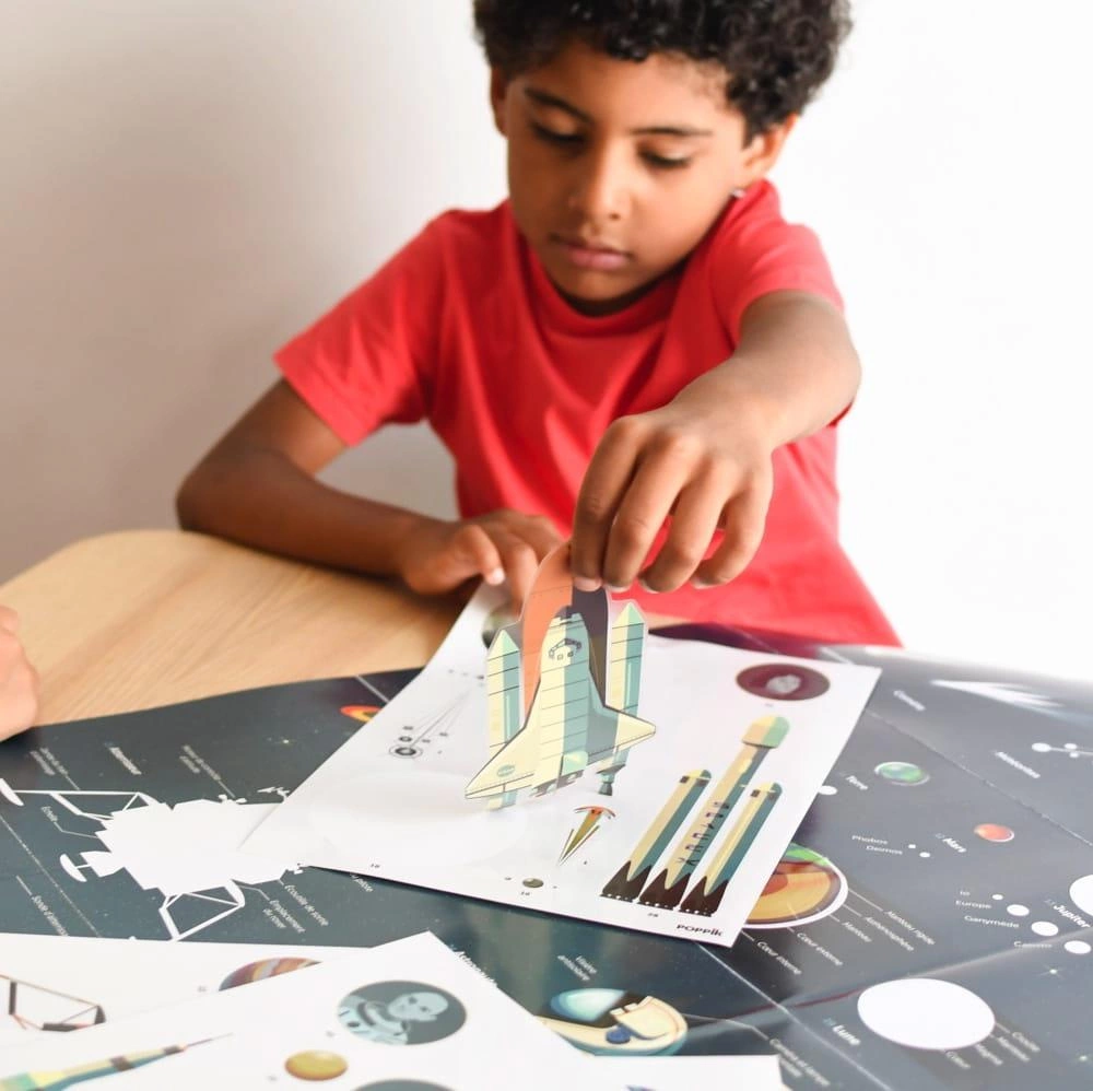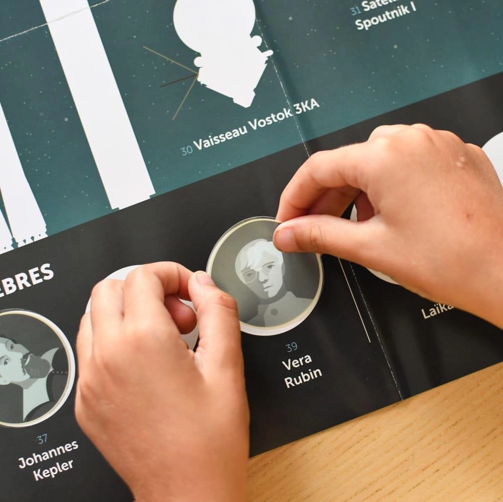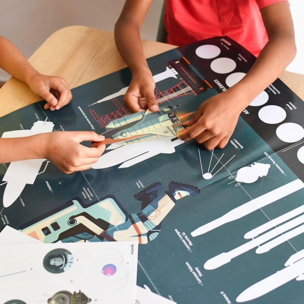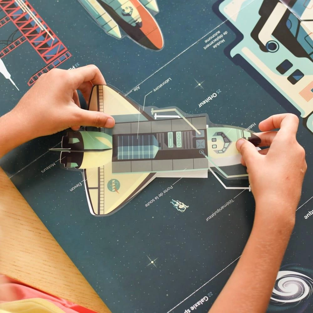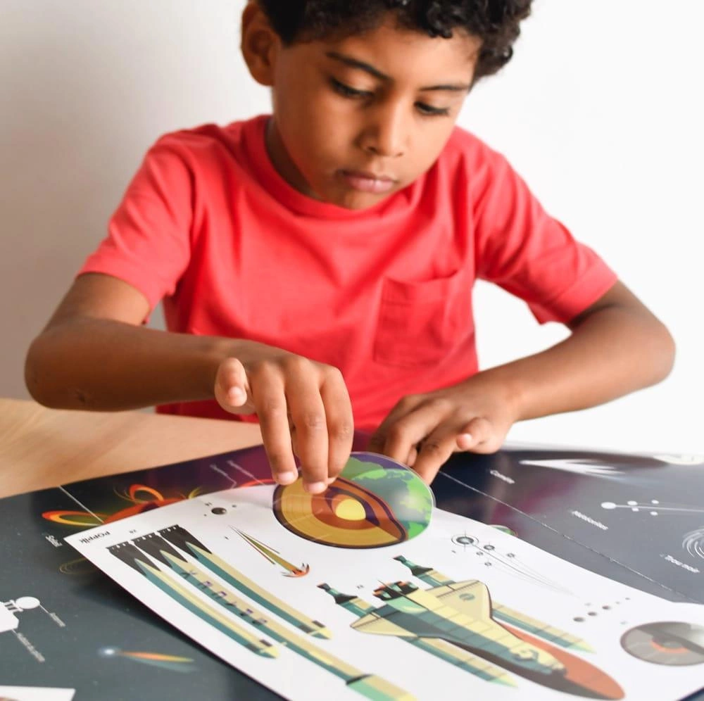 Plakat idealny dla pasjonatów kosmosu. Dziecko nakleja na plakacie 40 dużych naklejek,
