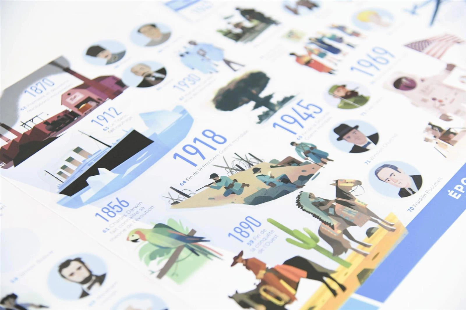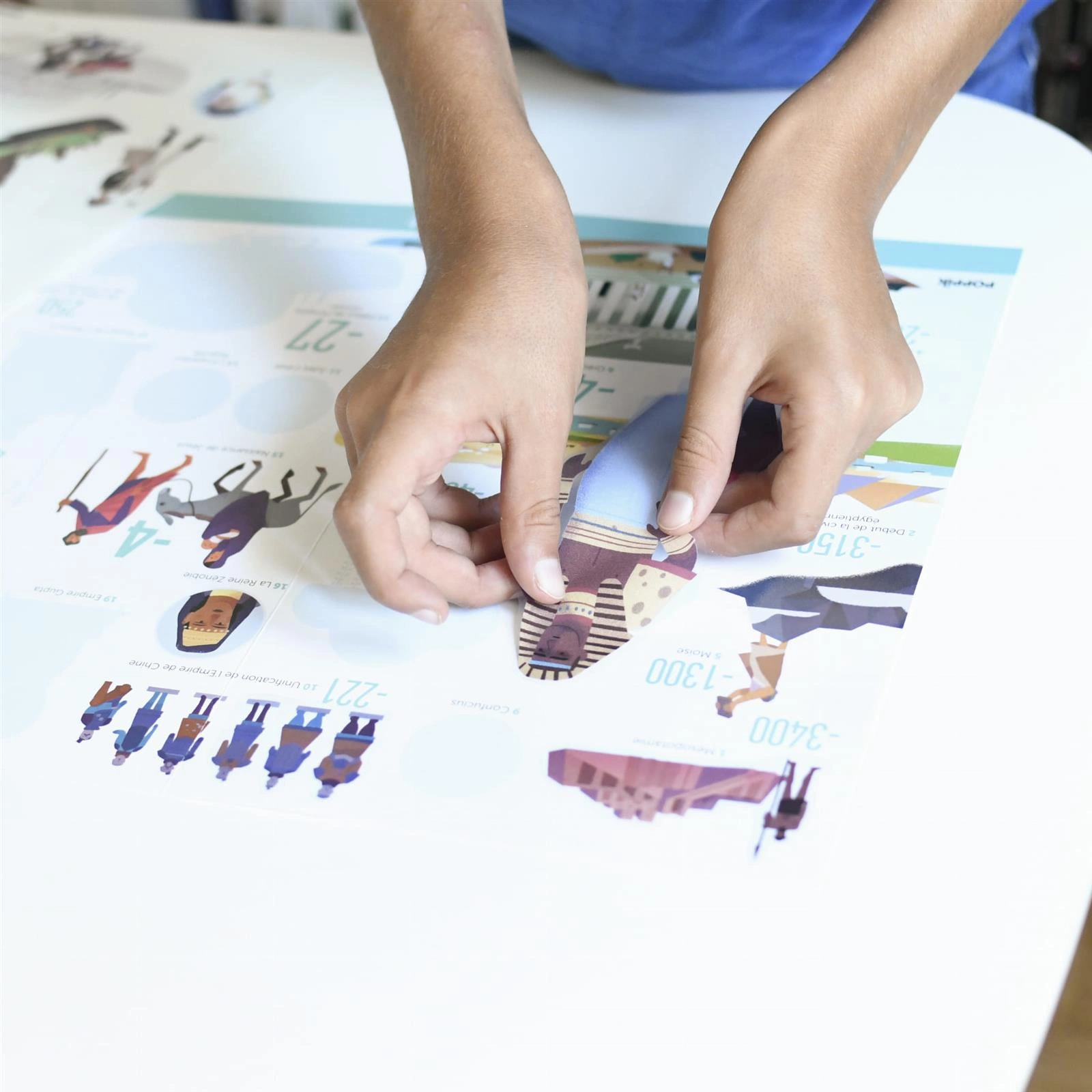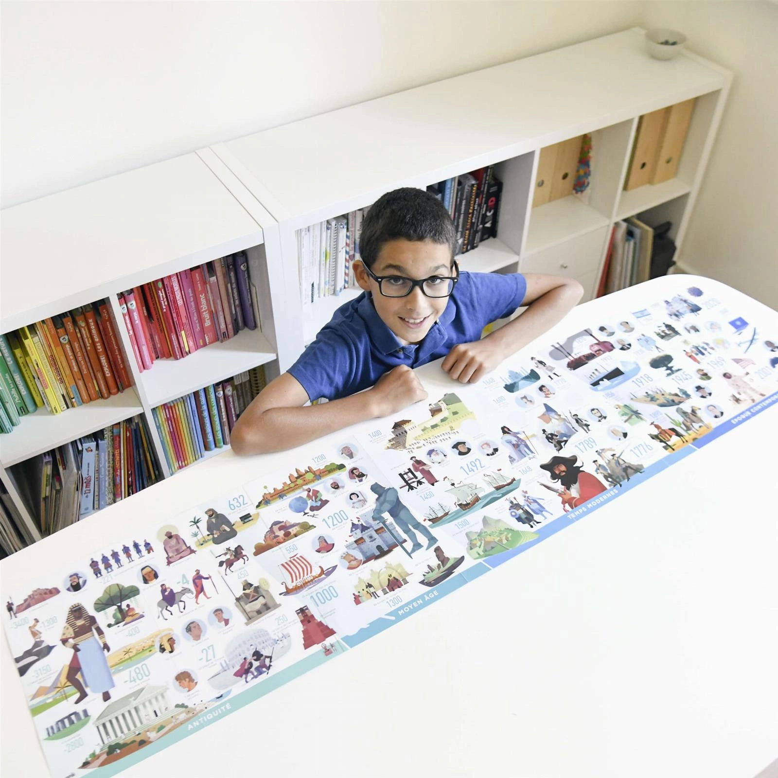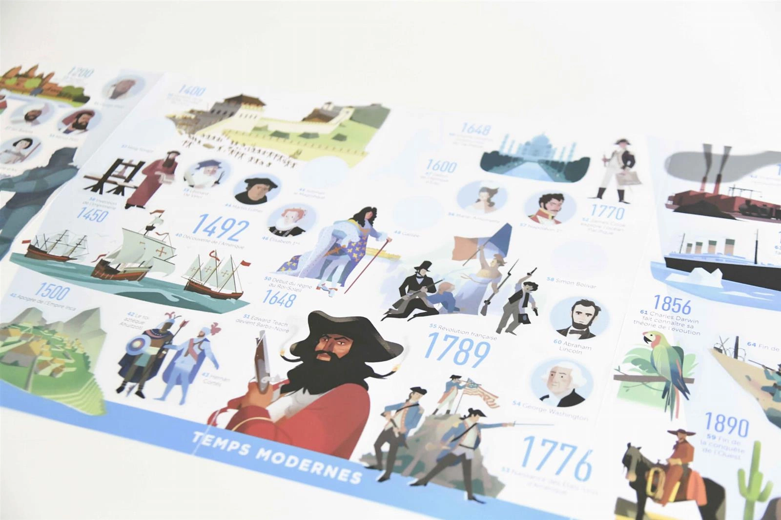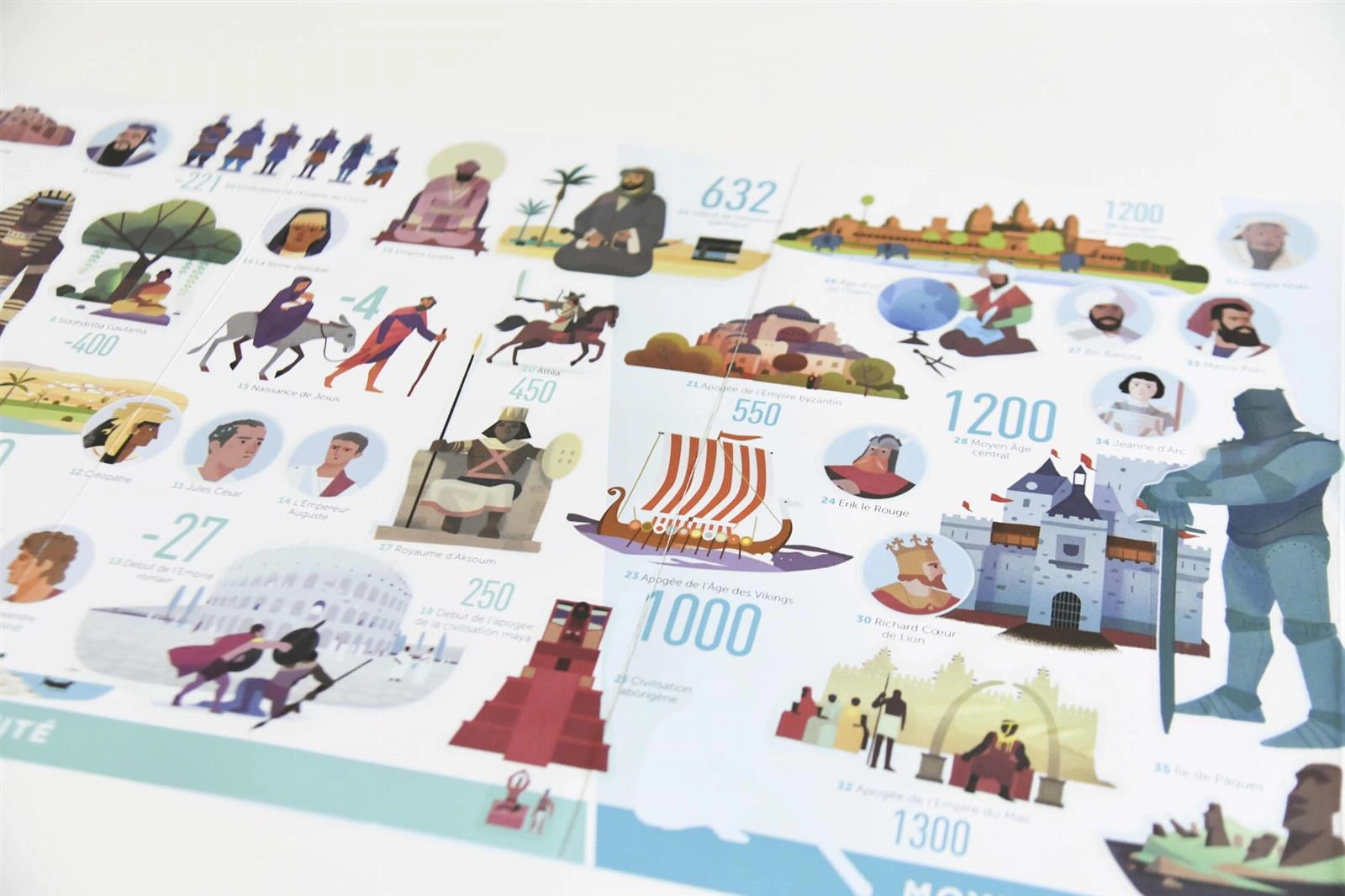 Odkryj ten duży arkusz historyczny, który będzie uzupełniony naklejkami z możliwością zmiany położenia w przypadku pomyłki. Dziecko nakleja na plakat 80 dużych naklejek, zgodnie ze wskazanymi numerami. W ten sposób identyfikuje wielkie okresy historyczne i odkrywa postęp cywilizacji, które naznaczyły historię świata. Musi również uzupełnić plakat portretem głównych mężczyzn i kobiet, takich jak Joanna d'Arc, Konfucjusz, Król Słońce czy nawet Barack Obama. Wspaniały plakat dla dzieci do nauki poprzez zabawę. Numerowany kod ułatwia rozpoznanie prawidłowego położenia każdej naklejki. Do plakatu dołączona jest 24-stronicowa książeczka zawierająca komentarz do każdej z 80 naklejek. Plakat jest dwustronny - z jednej strony wersja angielska, z drugiej - francuska.