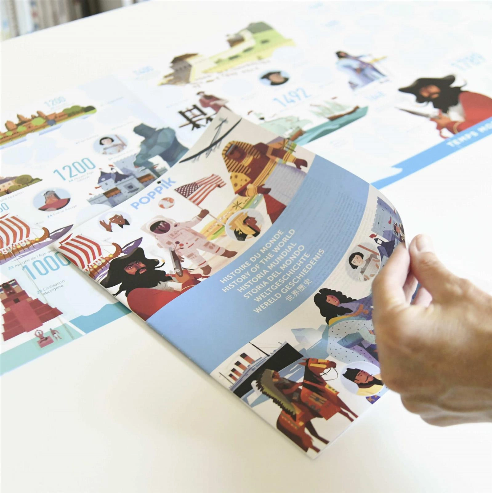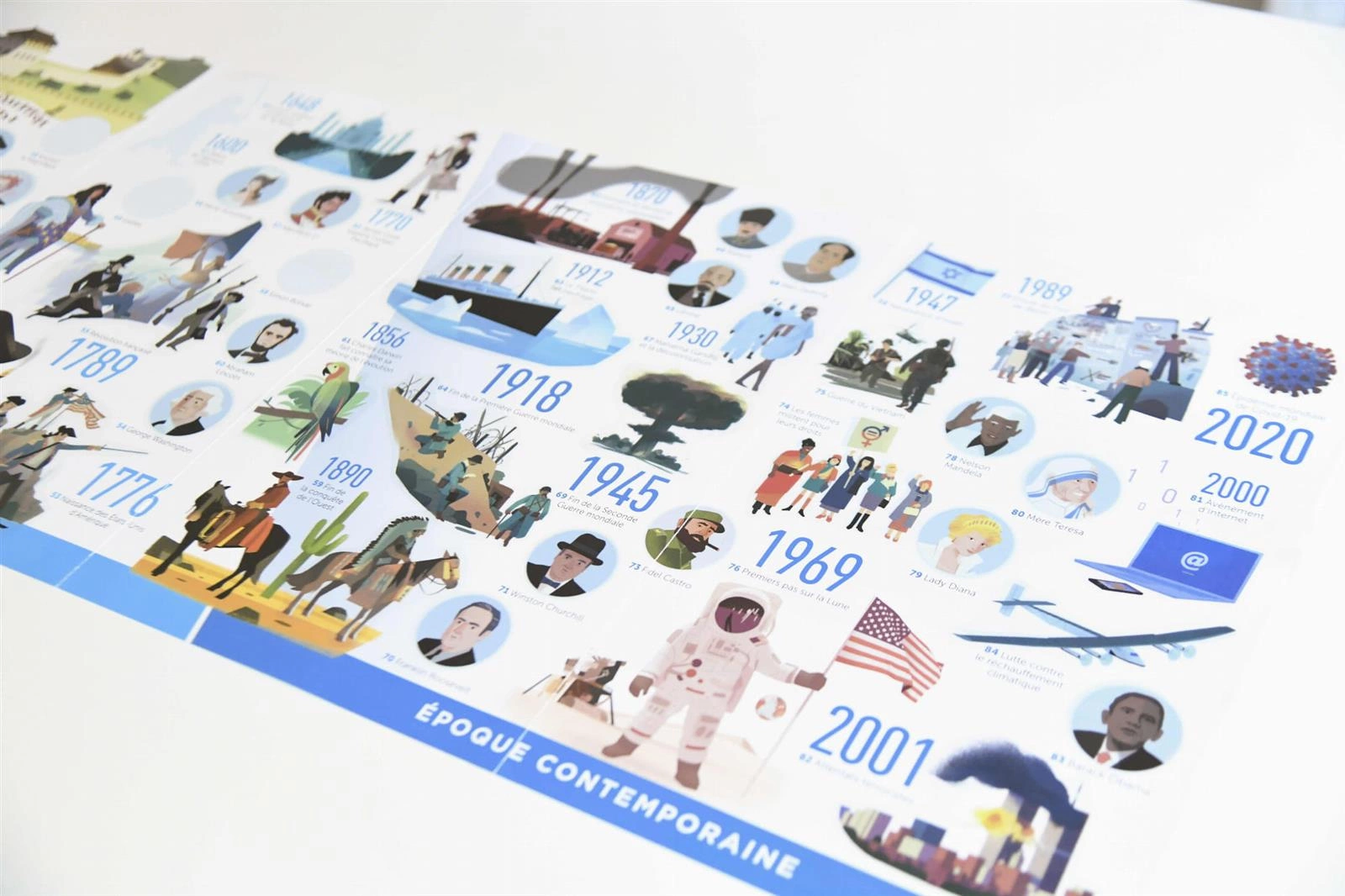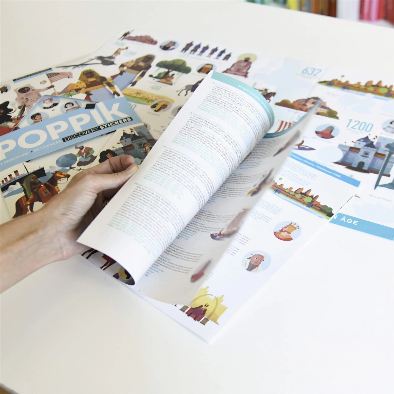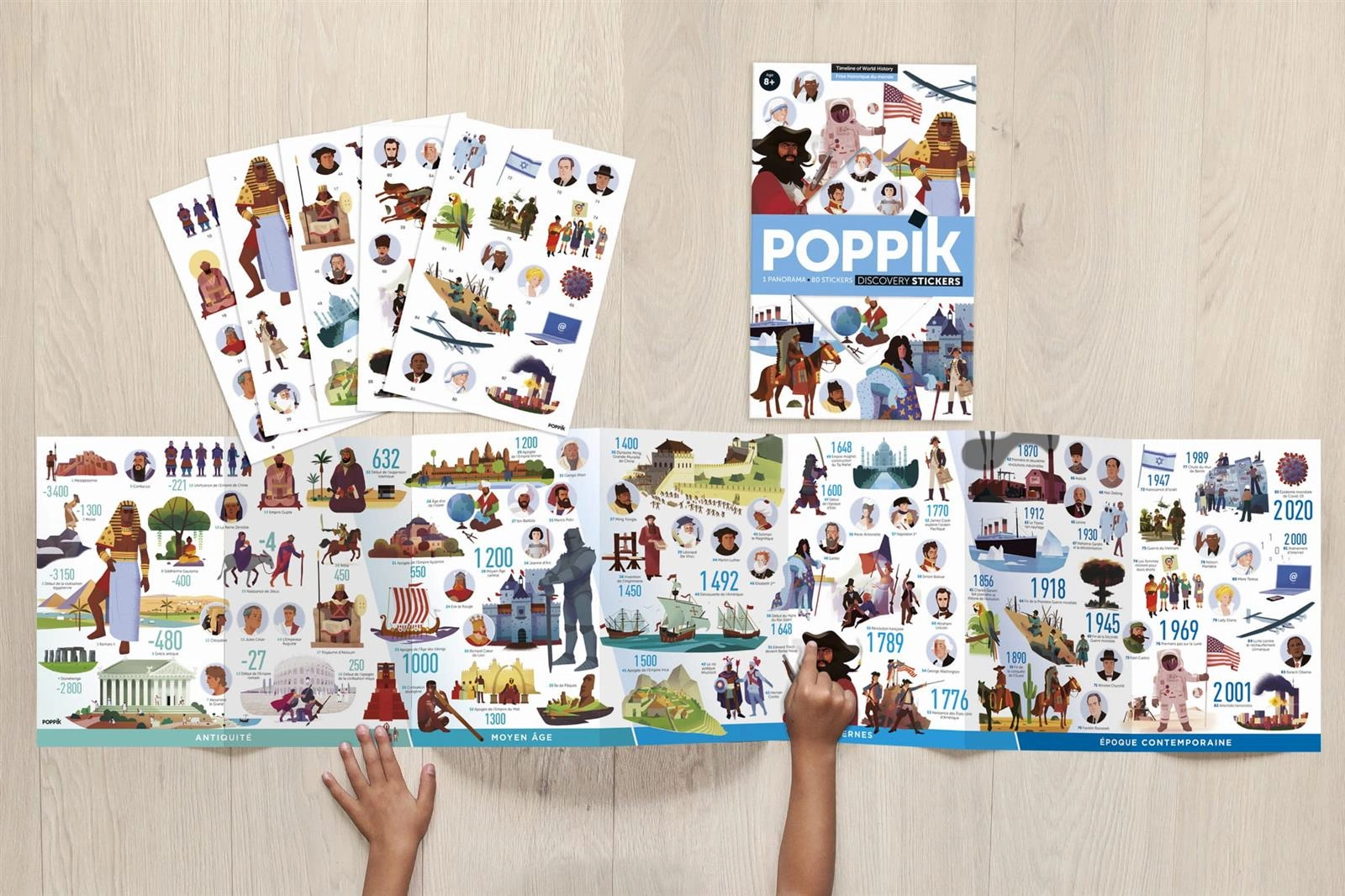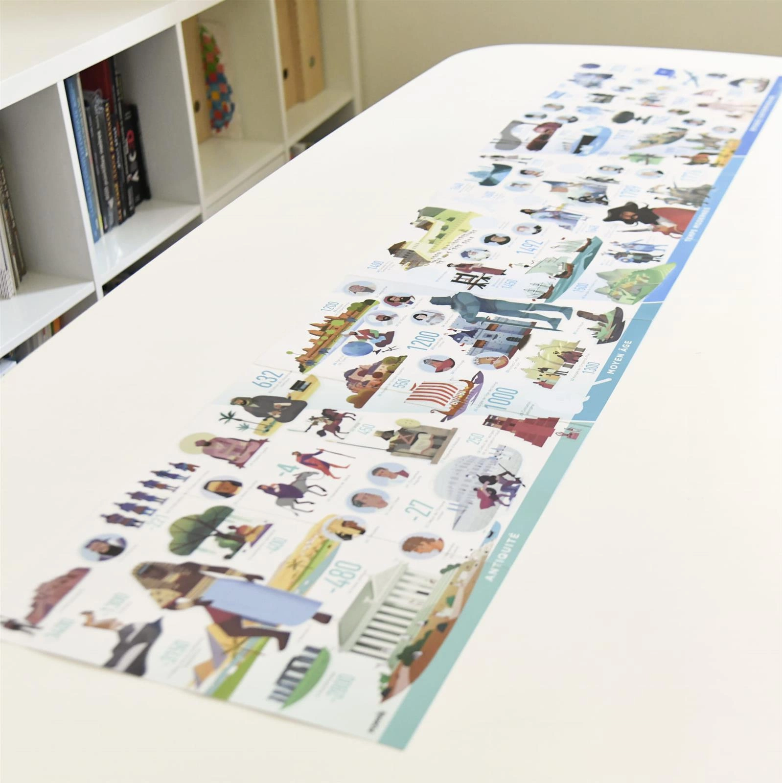 Odkryj ten duży arkusz historyczny, który będzie uzupełniony naklejkami z możliwością zmiany położenia w przypadku pomyłki. Dziecko nakleja na plakat 80 dużych naklejek, zgodnie ze wskazanymi numerami. W ten sposób identyfikuje wielkie okresy historyczne i odkrywa postęp cywilizacji, które naznaczyły historię świata. Musi również uzupełnić plakat portretem głównych mężczyzn i kobiet, takich jak Joanna d'Arc, Konfucjusz, Król Słońce czy nawet Barack Obama. Wspaniały plakat dla dzieci do nauki poprzez zabawę. Numerowany kod ułatwia rozpoznanie prawidłowego położenia każdej naklejki. Do plakatu dołączona jest 24-stronicowa książeczka zawierająca komentarz do każdej z 80 naklejek. Plakat jest dwustronny - z jednej strony wersja angielska, z drugiej - francuska.