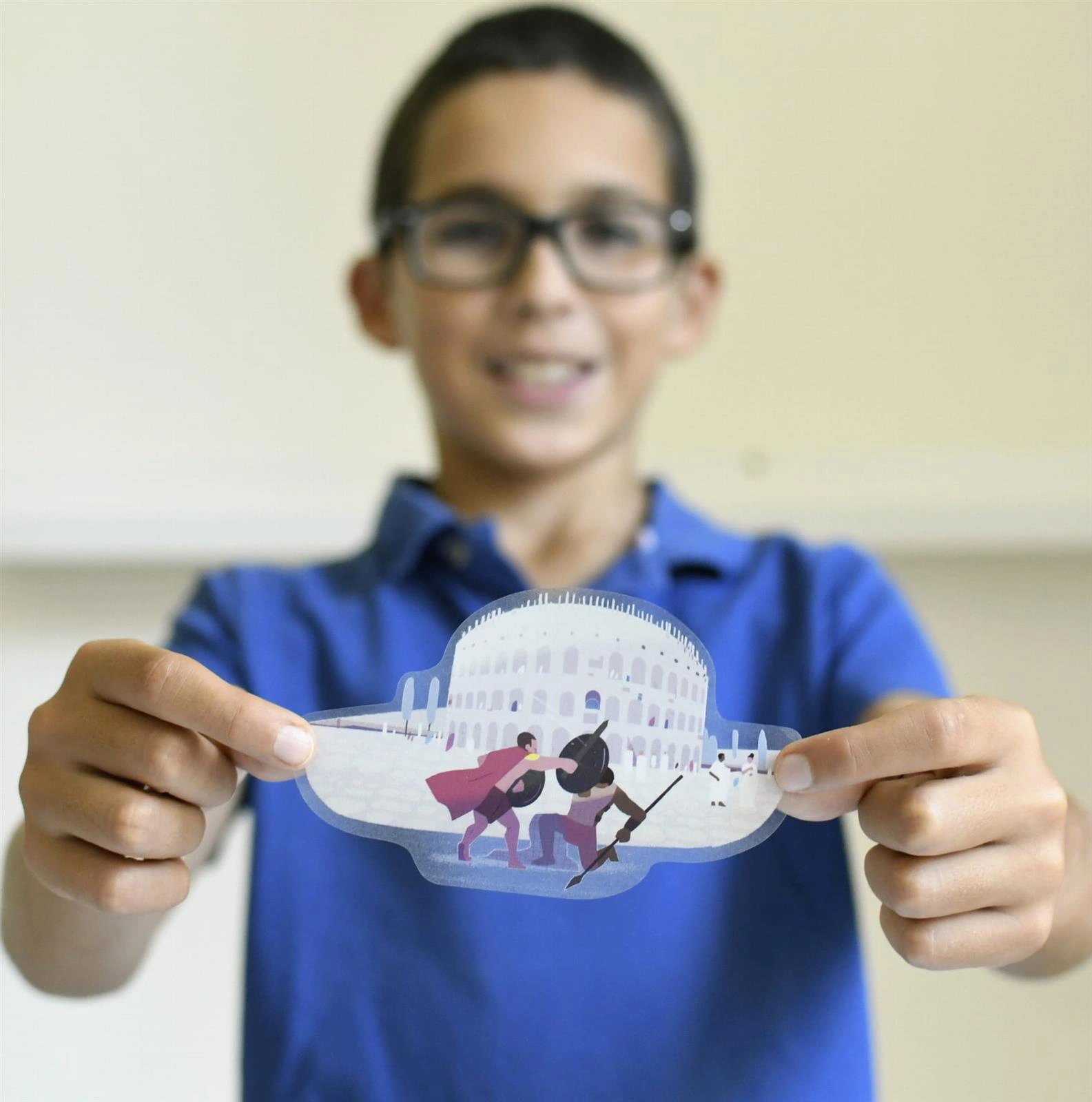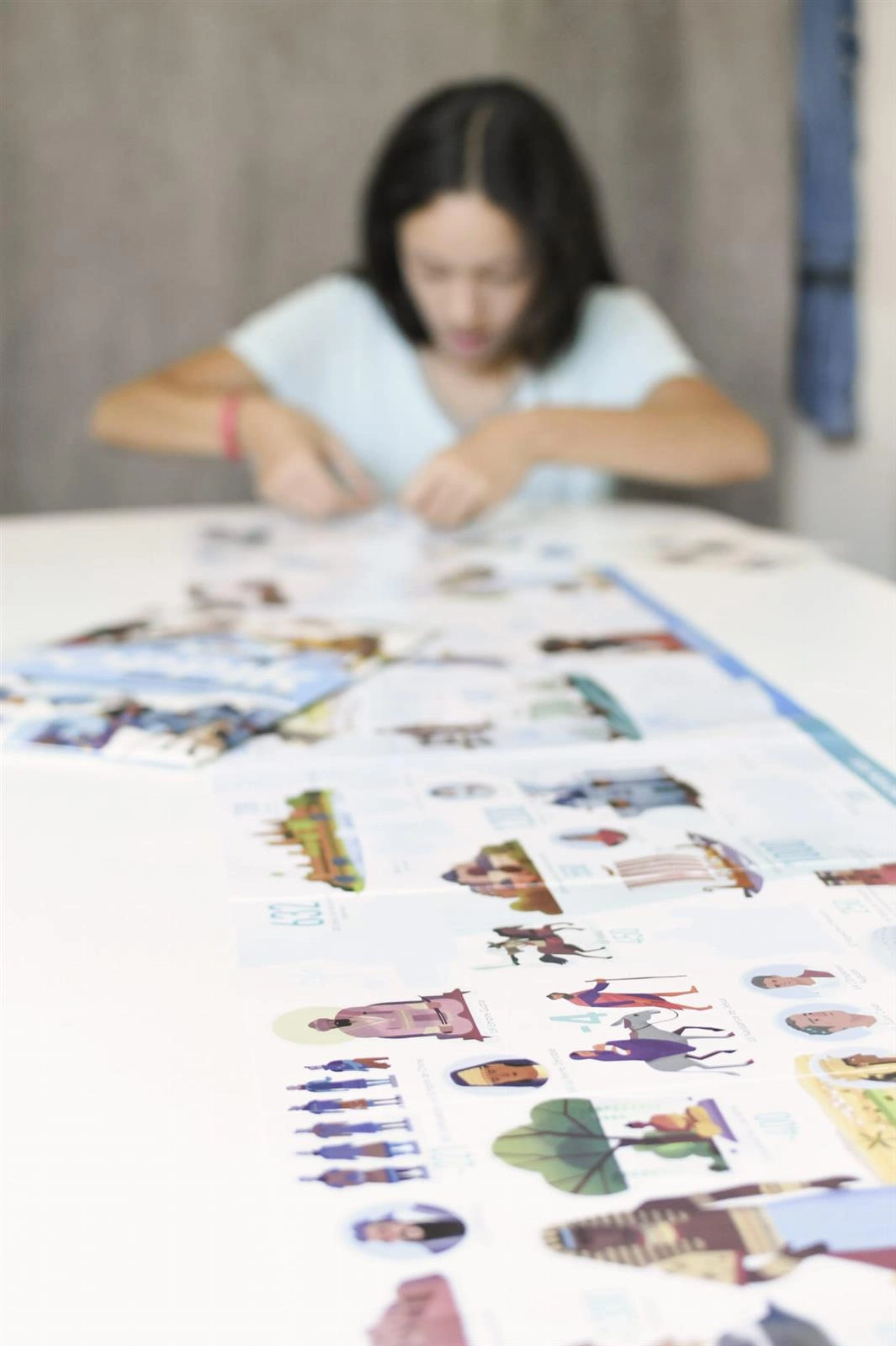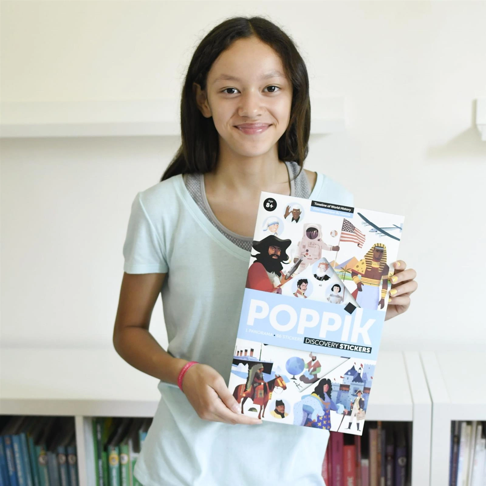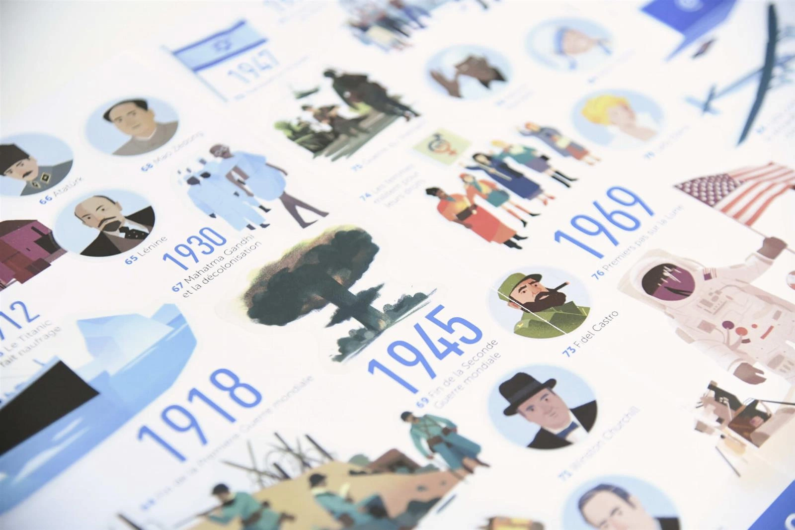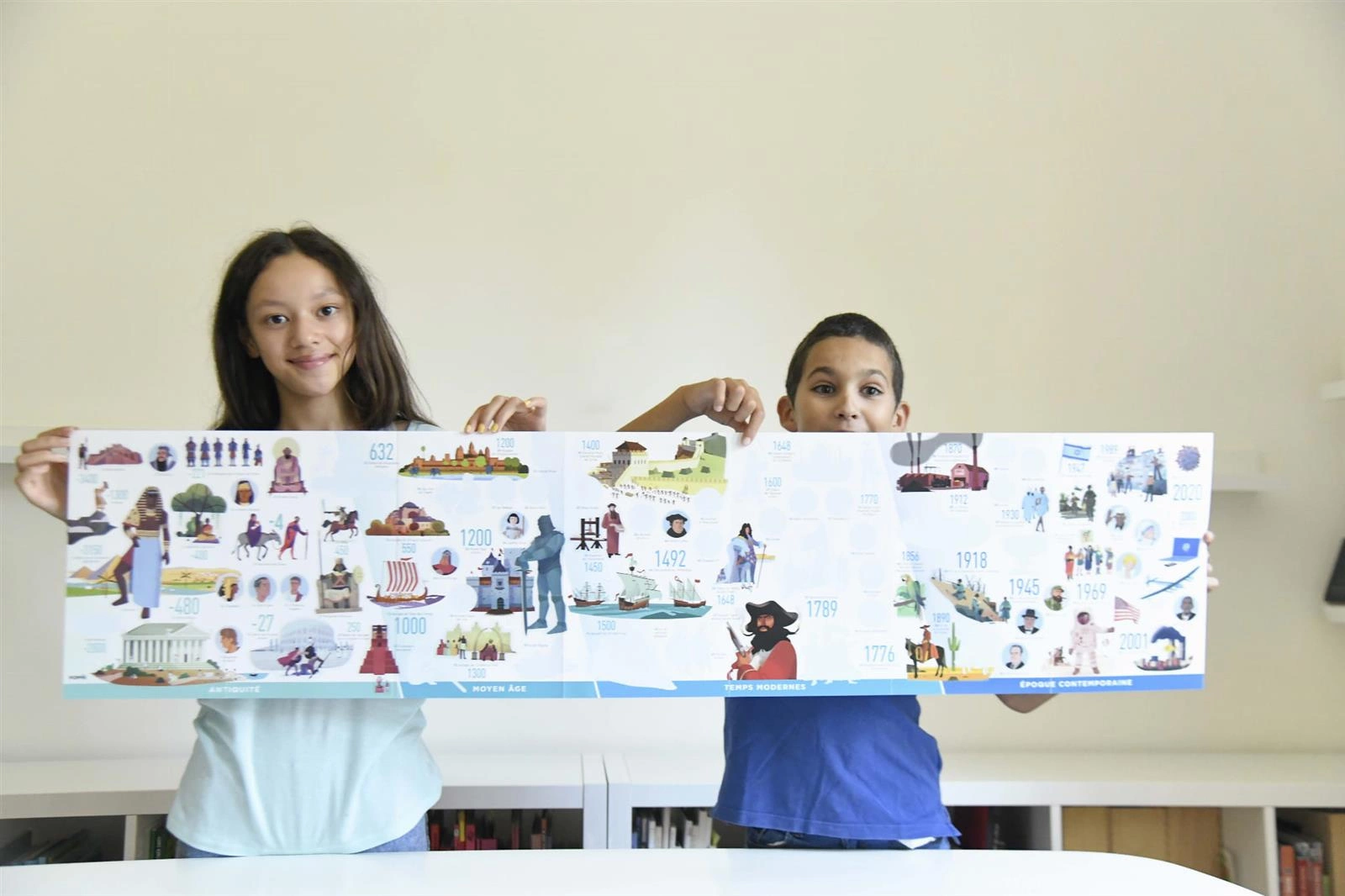 Odkryj ten duży arkusz historyczny, który będzie uzupełniony naklejkami z możliwością zmiany położenia w przypadku pomyłki. Dziecko nakleja na plakat 80 dużych naklejek, zgodnie ze wskazanymi numerami. W ten sposób identyfikuje wielkie okresy historyczne i odkrywa postęp cywilizacji, które naznaczyły historię świata. Musi również uzupełnić plakat portretem głównych mężczyzn i kobiet, takich jak Joanna d'Arc, Konfucjusz, Król Słońce czy nawet Barack Obama. Wspaniały plakat dla dzieci do nauki poprzez zabawę. Numerowany kod ułatwia rozpoznanie prawidłowego położenia każdej naklejki. Do plakatu dołączona jest 24-stronicowa książeczka zawierająca komentarz do każdej z 80 naklejek. Plakat jest dwustronny - z jednej strony wersja angielska, z drugiej - francuska.